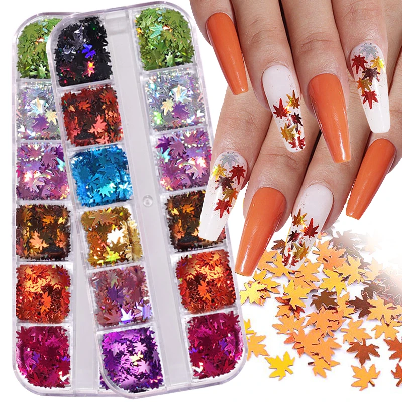 Блестки для ногтей в виде кленовых листьев, 12 ячеек, лазерный блес...