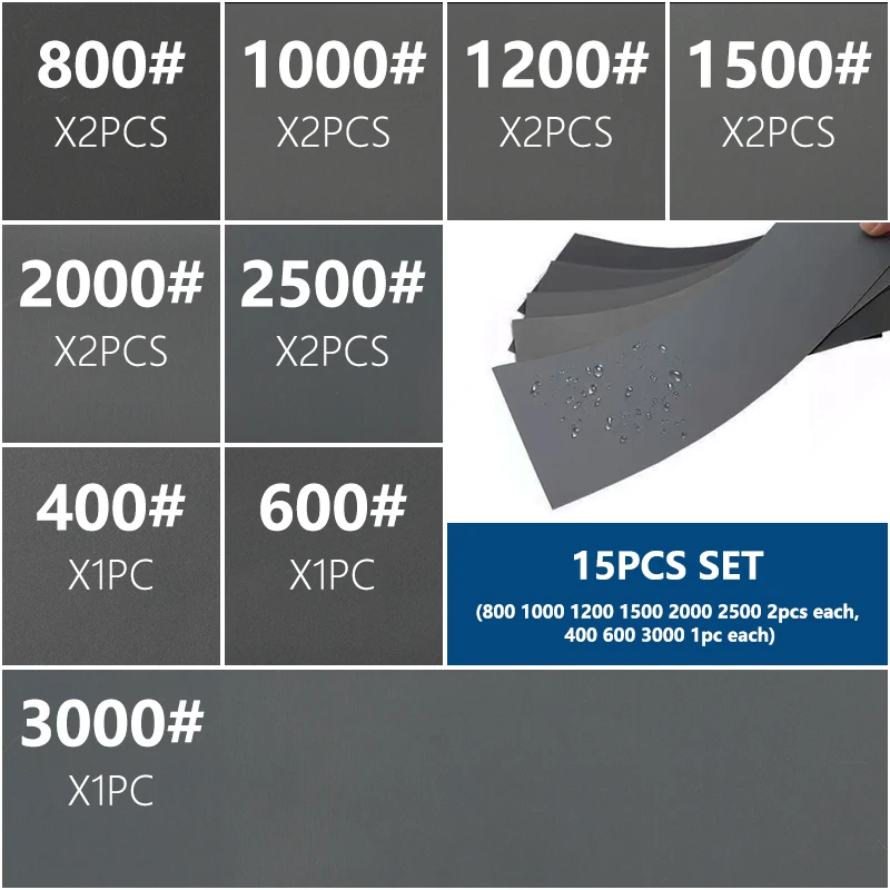 1. Ассортимент влажной сухой наждачной бумаги-мы предлагаем 15 шт. Ассорти наждачной бумаги листов, 4 листа каждой решетки: 400/ 600/ 800/ 1000/ 1200/ 1500/ 2000/ 2500/ 3000