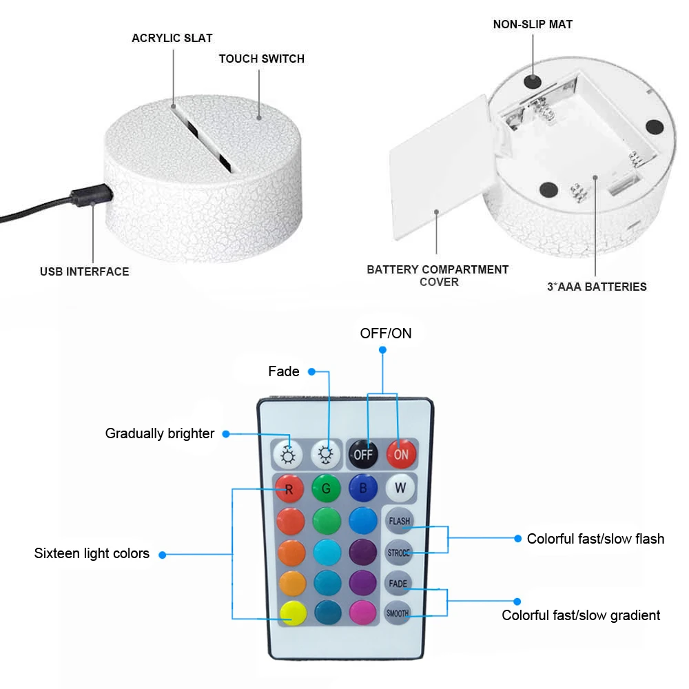 Особенности:1. Этот уникальный и очаровательный светодиодный 3D ночник-отличный романтический подарок для ваших друзей и себя2. Невероятный, только 2D Акриловый лист может быть использован для создания захватывающих 3D стереоскопических визуальных узоров и световых эффектов, которые выглядят ярко и полны индивидуальности, хороших световых эффектов и творчества.3. Акриловый лист толщиной всего 3,5 мм, но он может обеспечить волшебное 3D освещение, удобное и практичное, и простое в использовании4. Не только имеет трехмерное 3D освещение, но также может отображать красочные световые эффекты. Кнопочный переключатель может контролировать цвет освещения. Вы можете выбрать семь цветов, просто нажав на кнопочный переключатель.5. Высокое качество светодиодный источник света, низкое энергопотребление, долгий срок службы, соответствие с акриловой направляющей пластины, приносит вам мягкий, но достаточно яркий эффект освещения, нет ослепительной и высокой температуры, безопасен для использования.6. 7 цветов автоматически меняющийся режим с сенсорным кнопочным переключателем. Нажмите кнопку касания для последнего цвета, затем нажмите ее снова, режим автоматического изменения цвета работает.7. 16 цветовых режимов с сенсорным кнопочным переключателем и пультом дистанционного управления. Может управлять светом как сенсорной кнопкой, так и пультом дистанционного управления.Обратите внимание:1. Фактический цвет может немного отличаться от изображения из-за отличий монитора и светового эффекта. Замеры сделаны вручную, поэтому возможны отклонения на 0,5-2 см.2. Пульт дистанционного управления поставляется случайным образомСпецификация:Тип проекта: 3D светодиодный ночникМатериал основания: АБС-пластикМатериал направляющей пластины: акрилРежим питания: USB/батарея (не включая батарею)Входное напряжение: 5 ВИсточник света: светодиодРежим освещения: 3D стереограмма (как показано на картинке)Режим переключения: сенсорный переключатель + пульт дистанционного управленияНапряжение продукта: 5 ВМощность продукта: 3 ВтСтиль дистанционного управления поставляется случайным образом
