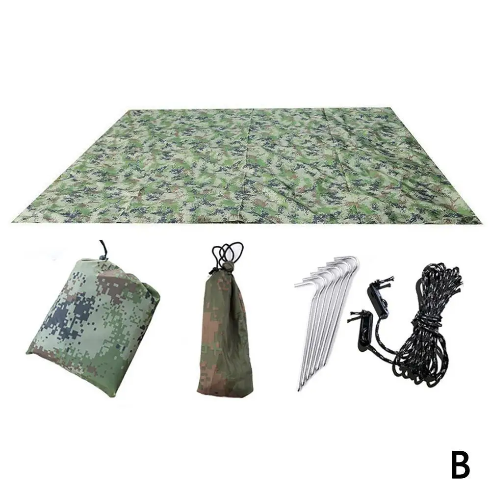 Описание100% новый и высокое качествоМатериал: брезентРазмер: 100*145 см/300*290Цвет: камуфляжНабор: солнцезащитный коврик 100*145 см + сумка для храненияB набор: 300*290 см коврик от солнца + Гвозди + веревки + сумка для храненияНе только палатка, но и влагостойкое одеяло для пикника.Прочная конструкция с кружевными отверстиями.Может выдерживать низкие и высокие температуры, подходит для 4 сезонов использования.Утолщенная водонепроницаемая и Солнцезащитная полиэфирная ткань.Примечание:1. По причине фотографирования, пожалуйста, допускайте незначительные различия в цветеПосылка включает в себя:1 шт. 100*145 см коврик от солнца1 шт. сумка для храненияИли1 шт. 300*290 см коврик от солнца6 гвоздей6 шт. канатов1 шт. сумка для хранения