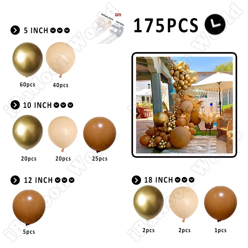 Кремовый персик (5 дюймов * 40 шт., 10 дюймов * 20 шт., 18 дюймов * 2 шт.) Какао (10 дюймов * 25 шт., 12 дюймов * 5 шт., 18 дюймов * 1 шт.) Золото (5 дюймов * 60 шт., 10 дюймов * 20 шт., 18 дюймов * 2 шт.) Бесплатно для вас: 5 м цепочка на воздушный шар * 1 Воздушный шар Клей * 100