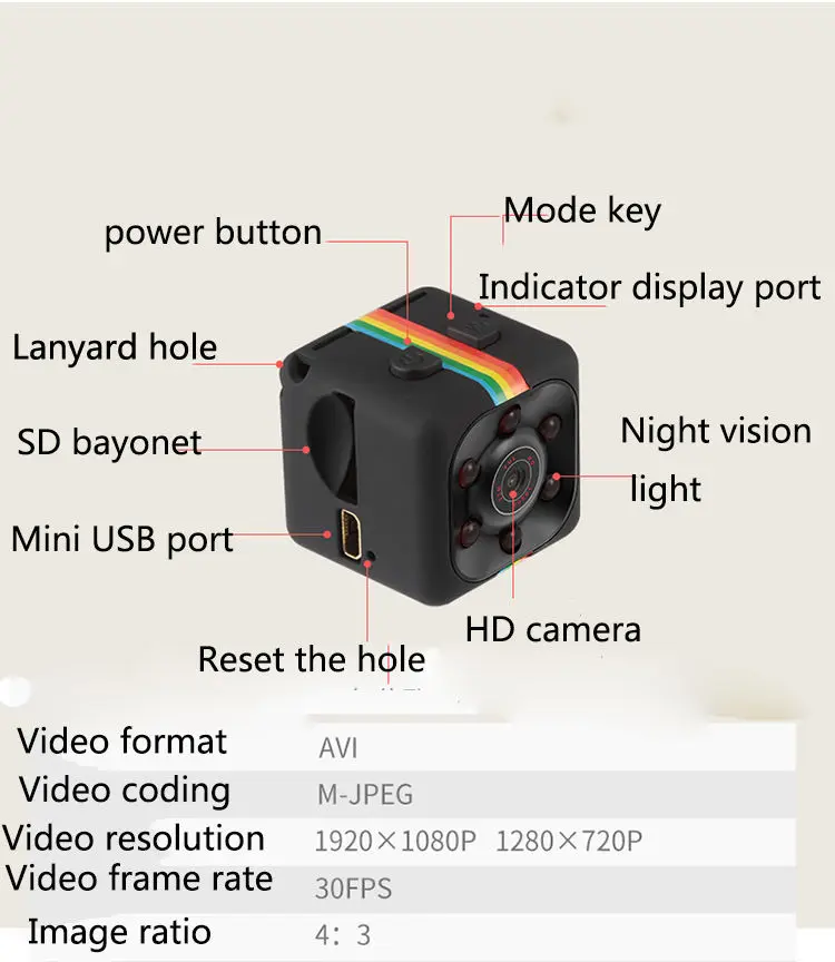 Угол обзора камеры: 120 градусов Формат видео: AVI Кодирование видео: M-JPEG Разрешение видео: 1920 × 1080P частота кадров в секунду: 30 кадров в секунду соотношение изображения: 16:9 Разрешение фото: 12 м (4032 × 3024) формат изображения: JPG Обнаружение движения: Поддержка Тип батареи: полимерный аккумулятор Емкость аккумулятора: 200 мА · ч Часы работы: Устойчивое видео в течение часа или около того Напряжение зарядки: DC-5V Поддержка хранения: до 32 г скорость передачи tf-карты: Высокая скорость USB2.0 Тип интерфейса: Мини 8pin USB Play программное обеспечение: система поставляется с или основным программным обеспечением для воспроизведения видео