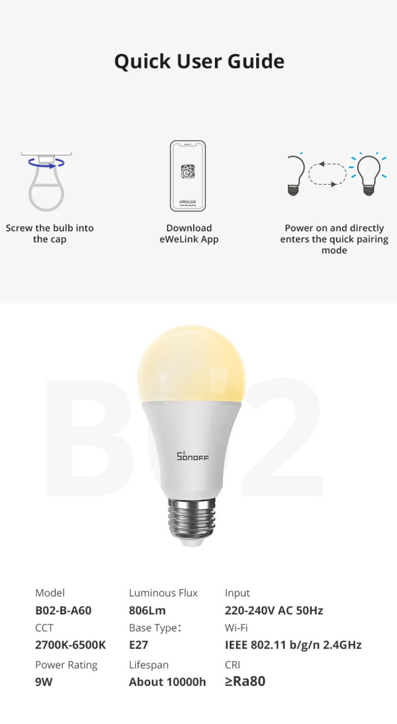 Входное напряжение смарт-лампы SONOFF Wi-Fi светодиодный 220-240 В, он недоступен в регионах США.