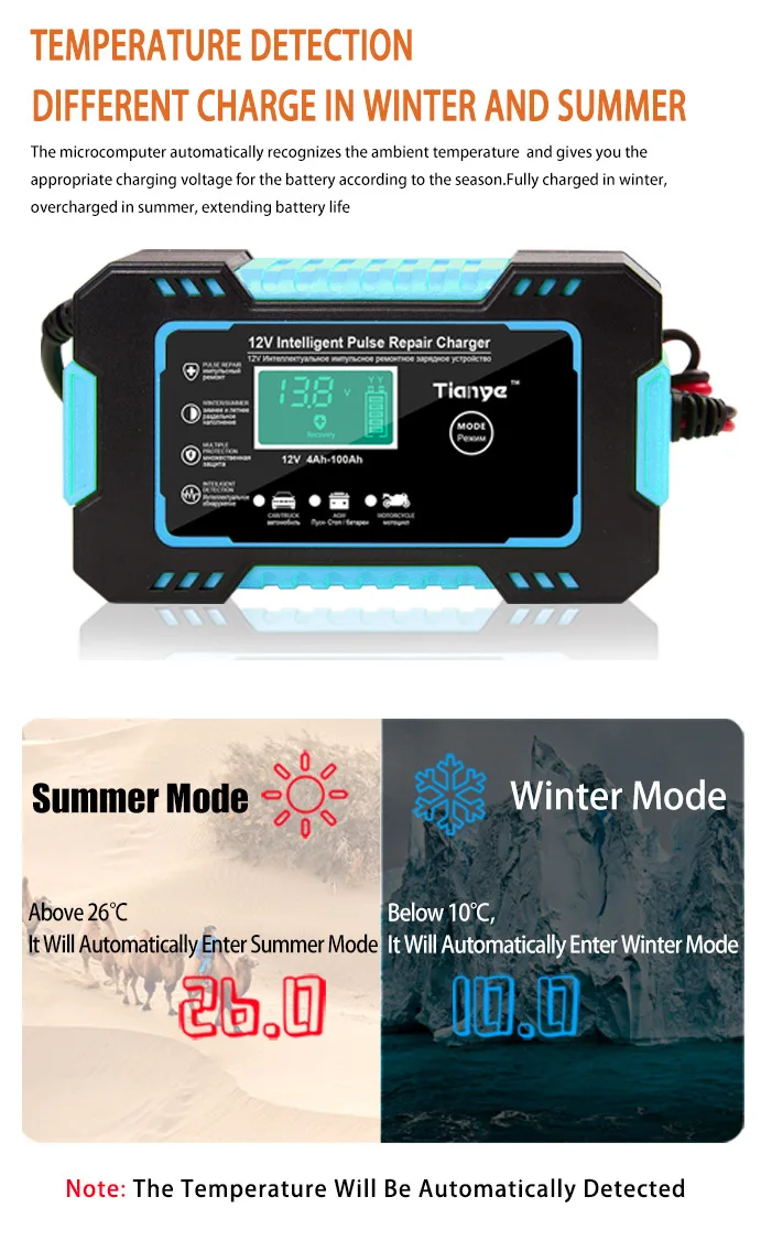 Микрокомпьютер автоматически распознает окружающую среду и дает вам соответствующее напряжение зарядки для аккумулятора в зависимости от сезона.Выше 26 °CАвтоматически войдет в летний режимНиже 10 °CОн автоматически переходит в зимний режимПримечание: температура будет автоматически обнаружена