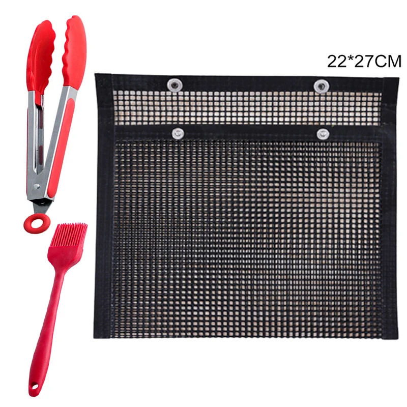 Продукт: барбекю сетки гриль мешок Размер: 22x27 см, 24x14 см Материал: тефлон Характеристики: сетчатый мешок для гриля, силиконовая щетка, щипцы для барбекю аксессуары для барбекю