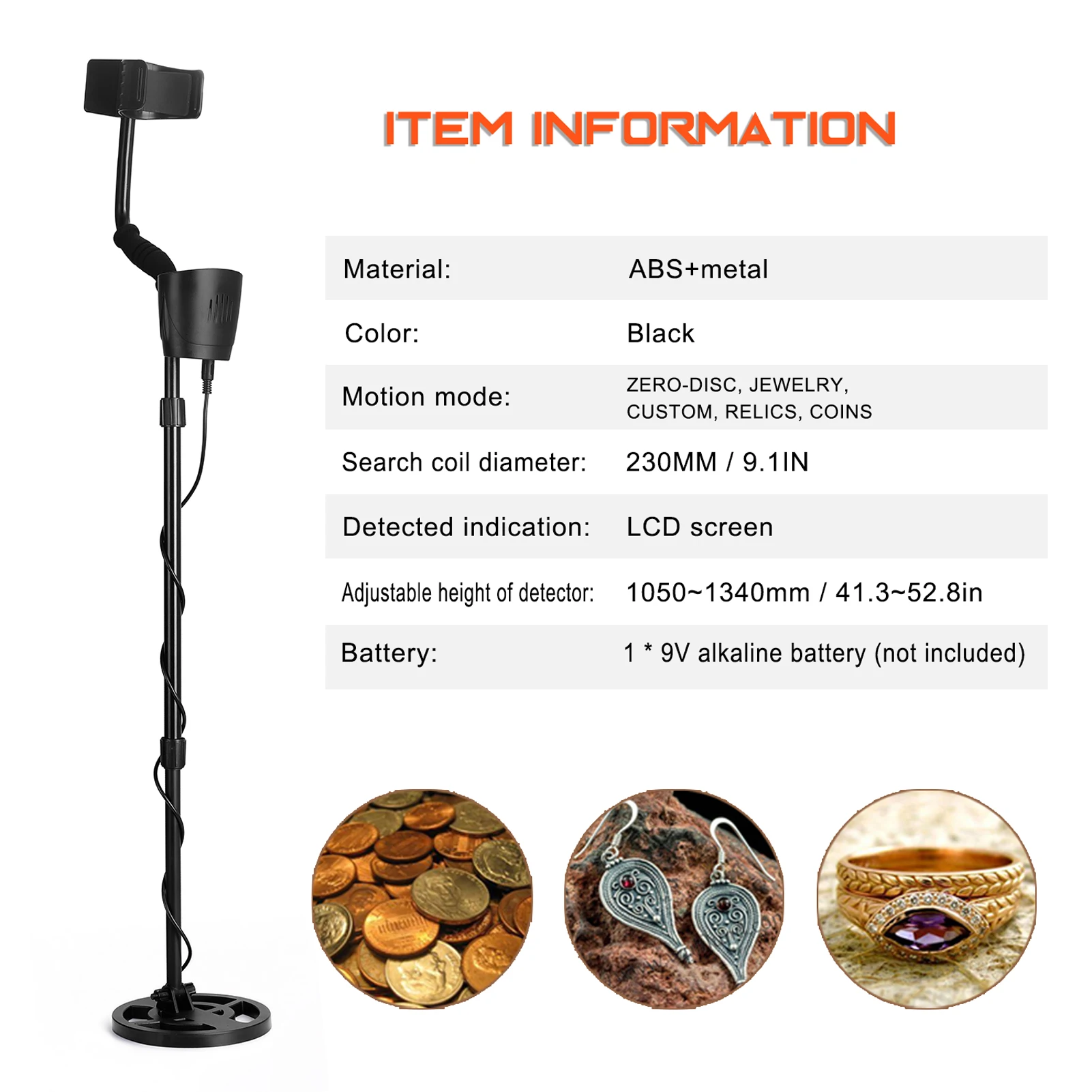 Особенности:3 режима работы-все металлические режимы-все различные типы металла будут обнаружены, такие как: монеты, реликвии, ювелирные изделия, золото и серебро и т. Д.; режим диска-помогает устранить целевые категории и повысить эффективность обнаружения; Точка отсчета: позволяет более точно определить цель.Водонепроницаемый поисковая катушка-7,9 дюйма Диаметр поисковая катушка и стержень позволяет использовать металлический каркас для того, чтобы исследовать под водой, идеально подходит для обнаружения на пляже или в потоке (корпус управления не является водонепроницаемым).Отличительные звуковые тона-различные аудио тонны могут помочь сказать, какой тип металла вы обнаружили. Принять 3,5 мм для наушников, таким образом, вы можете подключить его с помощью наушников (не входит в комплект), которая никогда не беспокоить шумных условиях (объем может быть создан из по возрастанию).Подходит для всех возрастов-металлоискатель соответствует эргономичному дизайну, удобен и удобен в использовании с регулируемым стержнем, расширяющимся от 31, 5 дюймов до 41, что позволяет ему идеально подходит для пользователей различной высоты, конструкция подлокотника экономит больше усилий для вас.Отличный подарок-детектор-отличный подарок для мальчиков и девочек! Используйте дома, чтобы найти потерянные ногти или другие металлы, или упакуйте их для легкого путешествия в любое из ваших любимых мест для охоты за сокровищами!Спецификация:Цвет: черныйМатериал: АБС + алюминийАккумулятор: 1 x батарея 9 В (не входит в комплект)Рабочее напряжение: ≥ 9 вЧувствительность: ≤ 180 мм (Монета: USΦ25)Водонепроницаемый диаметр поисковой катушки: 20 см/7,9 дюймаРежим обнаружения: discipation + All Metal + PinpointerОбнаружение объектов: металл (включая железо, алюминий, монеты, золото, бронза, серебро)Чувствительность: регулируемаяОбъем: РегулируемыйРазъем для наушников: 3,5 мм (наушники не прилагаются)Регулируемая высота: 80-105 см/31,5-41,3 дюймаВес изделия: 946 г/2,1 фунтаУпаковочный лист:1 * металлоискатель1 * Руководство пользователя