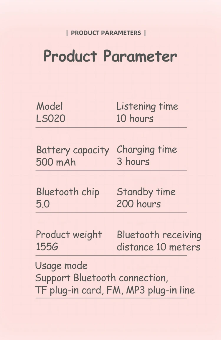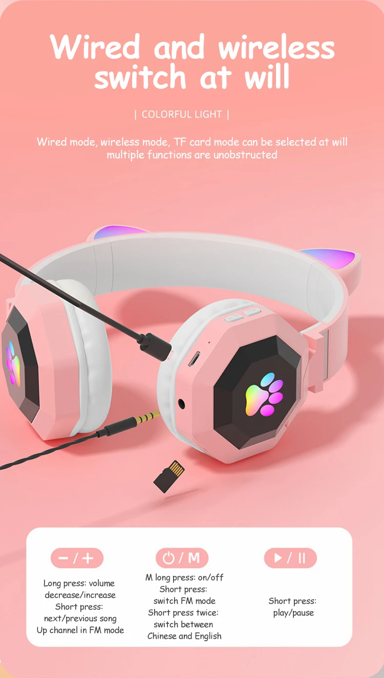 1. Функция Bluetooth + MP3 поддерживает воспроизведение стерео музыки, телефонные звонки.2. Поддержка всех аудиоустройств с поддержкой Bluetooth, таких как мобильный телефон, планшетный ПК, ноутбук, компьютер и т. д.3. 3,5 мм аудио разъем, обеспечивает простой проводного подключения различные устройства по беспроводной сети через Wi-Fi.4. Вы можете отвечать или отклонять телефонные звонки в любое время и в любом месте.5. Зарядка через USB, перезаряжаемый аккумулятор, удобный и практичный.6. Время работы до 10-12 часов, время работы в режиме разговора до 10 часов, время работы в режиме ожидания до 100 часов.7. Хорошее качество, складная конструкция и регулируемые по длине петли, очень удобно носить и легко носить с собой.8. Лучший выбор для прослушивания музыки, просмотра фильмов, общения в Интернете и т. д.9. Благодаря вставке sd-карты, без какого-либо устройства bluetooth, вы можете наслаждаться музыкой в любое время в любом месте.10. Радужные наушники с кошачьими ушками, Детские праздничные подарочные наушники.
