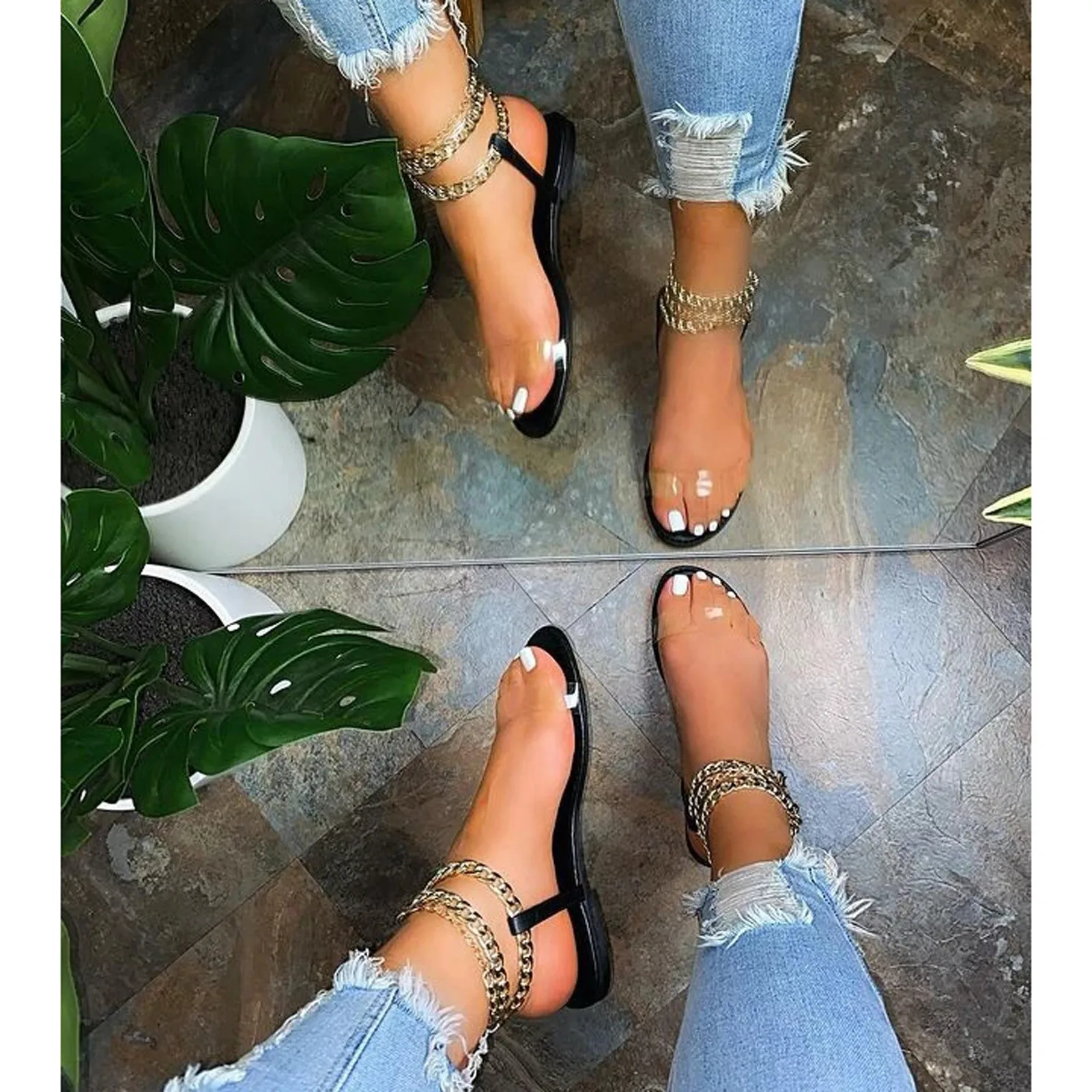 Женские босоножки на плоской цепочке, Новинка лета 2021, стильные сандалии на плоской подошве, модная однотонная уличная женская обувь с открытым носком и цепочкой, женская обувь