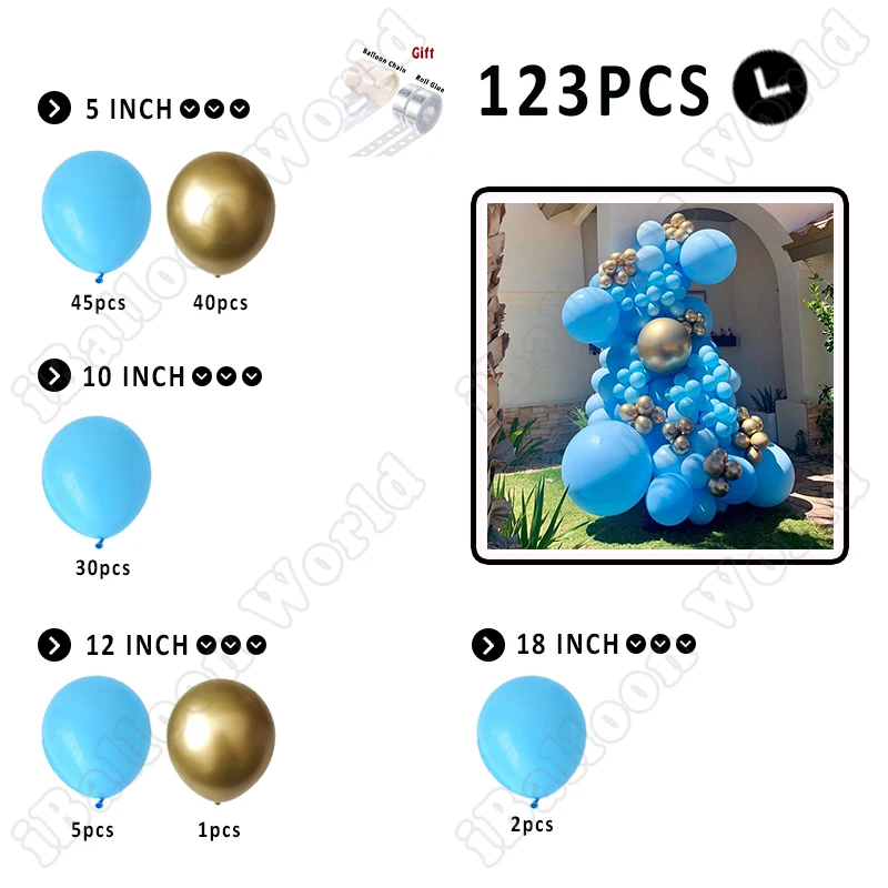 Синий светильник (5 дюймов * 45 шт., 10 дюймов * 30 шт., 12 дюймов * 5 шт., 18 дюймов * 2 шт.) Золото (5 дюймов * 40 шт., 12 дюймов * 1 шт.) Бесплатно для вас: 5 м цепочка на воздушный шар * 1 Воздушный шар Клей * 100