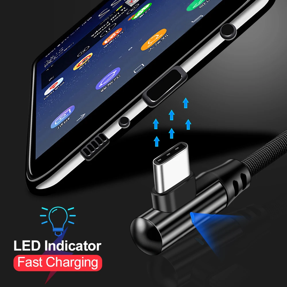 Кабель USB Type-C, 90 градусов, 3 А, шнур для быстрой зарядки и передачи данных для Samsung S10, S9, Huawei P30, Xiaomi, светодиодные кабели, зарядный провод