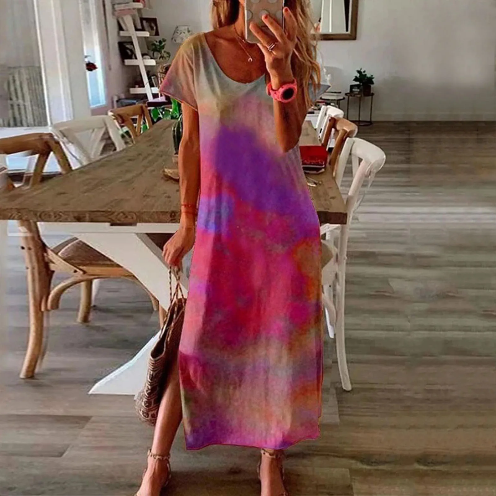 Женское длинное платье макси, повседневное пляжное платье с коротким рукавом, прямые платья с принтом в гавайском стиле