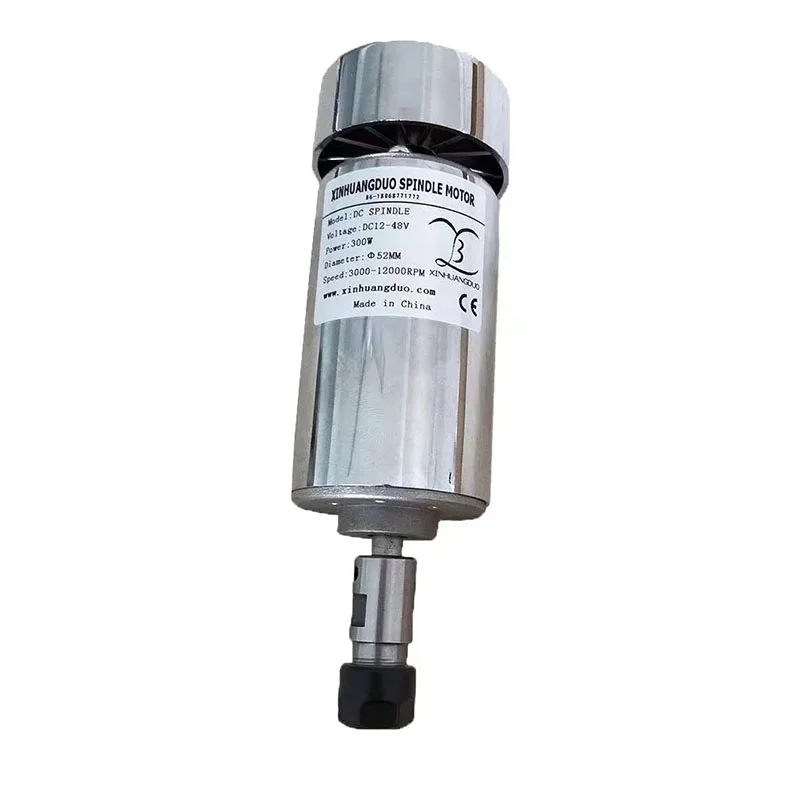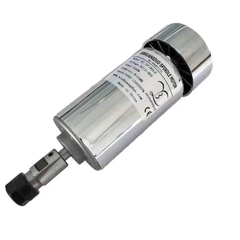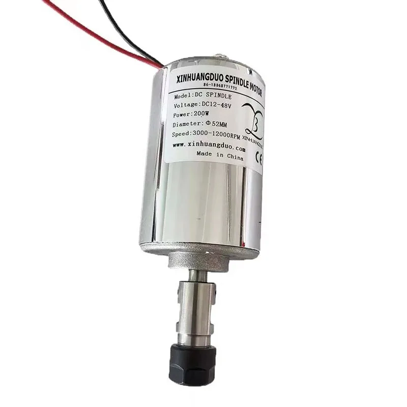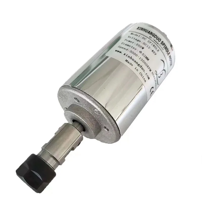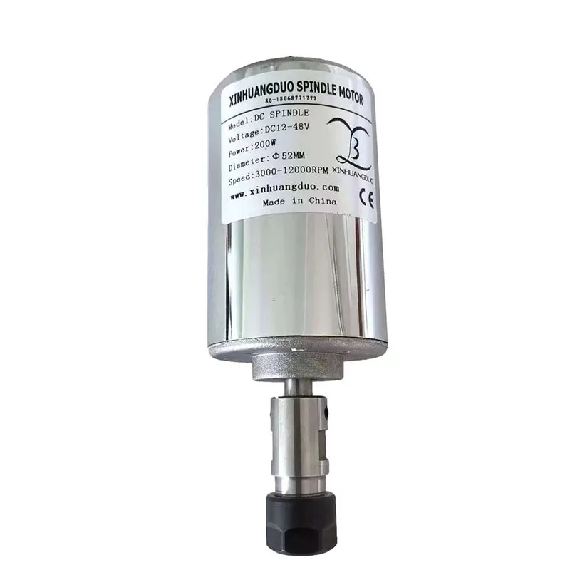Параметры продуктаМотор шпинделя: Совершенно новый хромированный двигатель шпинделя постоянного тока с жесткостьюРабочее напряжение: 12-48VDC (двигатель шпинделя постоянного тока)Мощность: 200W300W400W500W поворотСкорость: 3000-12000/мин (12-3000 об/мин, 24-6000 об/мин, 36-9000Поворот, 48в-12000 поворот)Крутящий момент: 550mN.mСопротивление изоляции:> 2 megohmsДиэлектрическая изоляция: 500 ВДиаметр: 52 ммДлина патрона: 35 мм хвостовика (включая гайку и ядро 43 мм)Диаметр патронной части: 16 ммОбщая длина мотора: 175 мм (в том числе Зажимная часть и мотора) радиальное биение шпинделя составляет около 0,02-0,05.Может использоваться для гравировки материалов, таких как металл или неметалл