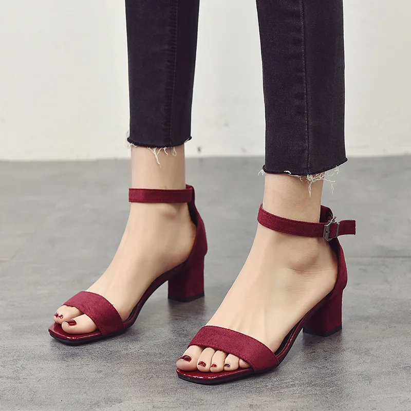 Сандалии женские на толстом каблуке, замшевые босоножки на среднем каблуке, с пряжкой и открытым носком, лето 2021