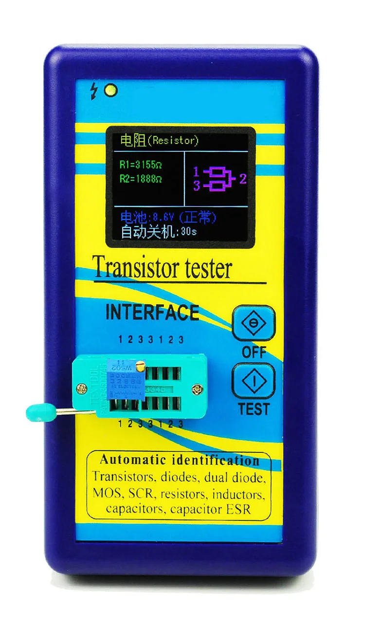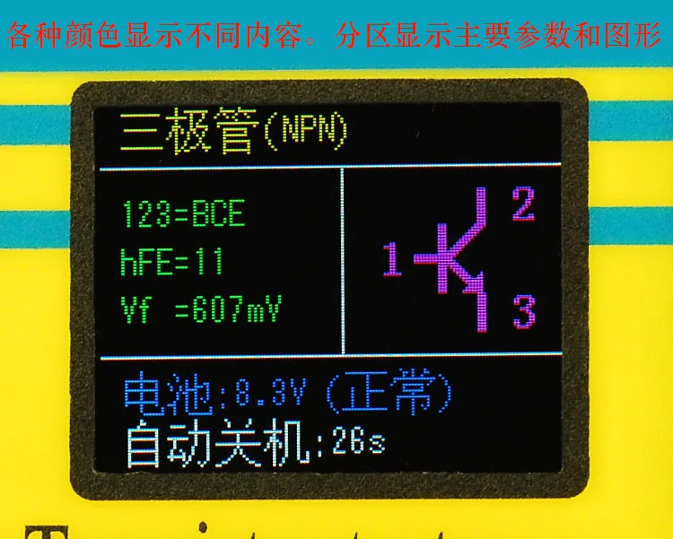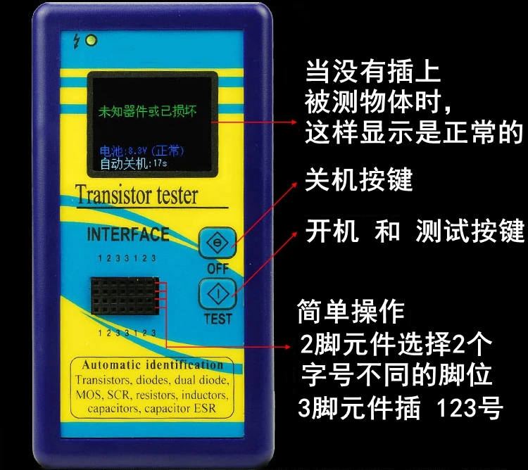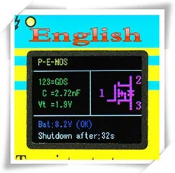 1.: Одно ключевое измерение, автоматическое выключение с задержкой времени. Выключите только ток20nA, Поддержка работы батареи. 2.: Автоматическое обнаружениеPNPИNPNБиполярный транзистор,N、ПКаналMOSFET,JFETПолевой транзистор, диод, двойной диод, тиристор, сопротивление, емкость, индуктивность. Автоматическое определение контакта. 3.: Измерение коэффициента усиления тока биполярного транзистора (B) И напряжение проводимости соединения эмиттера (УФ). Транзисторы Дарлингтона могут быть идентифицированы высоким пороговым напряжением и высоким коэффициентом усиления тока. 4.: Биполярные транзисторы иMOSFETВнутренний защитный диод и дисплей на экране. 5: ИзмерениеMOSFETПороговое напряжение и емкость ворот. 6: Поддерживает измерение двух сопротивлений, потенциометры также могут быть измерены. Если потенциометр настроен на один конец, тестер не может отличить середину и два конца штифта. 7: Какое разрешение измерения сопротивления0,1Ом, самое высокое измеренное значение50 мОм. 8: Диапазон измерения емкости от25pfReach100mF(10Десять тысячУФ) Разрешение до1 пФ, Диапазон измерения индуктивности0,01 MH-20 ч, В противном случае, он будет отображаться как сопротивление, если сопротивление постоянного тока индуктора выше, чем2100Ом также будет отображаться как сопротивление.Во время испытания емкости, что на экране потери, затухание означает, что чем больше значение, тем ближе конденсатор будет ломаться! Сопротивление ESRIt, чем меньше количество, тем лучше производительность ёмкости! 9: Он может быть обнаружен2 мкФЭквивалентная серия сопротивления выше конденсатора (ESR), Разрешение0,01Ом. Эта функция очень важна для определения производительности емкости. 10: Правильный символ направления может быть отображен для обоих диодов, также отображается падение переднего напряжения. 11:СветодиодныйОбнаруженный как диод, падение переднего давления выше, чем нормальное значение. Двойной светильник, излучающий диоды, обнаруживается как двойные диоды. В то же время светодиодный мигнет. 12: Каждый тест занимает около двух секунд, только Большая емкость и измерение индуктивности займет долгое время