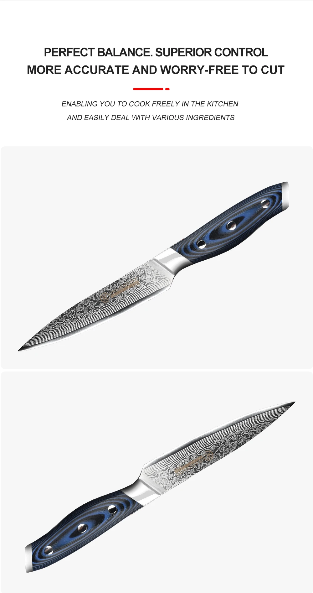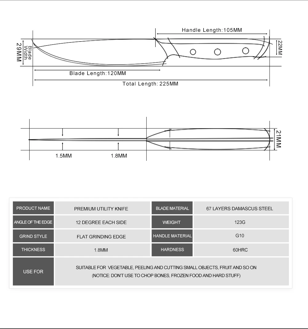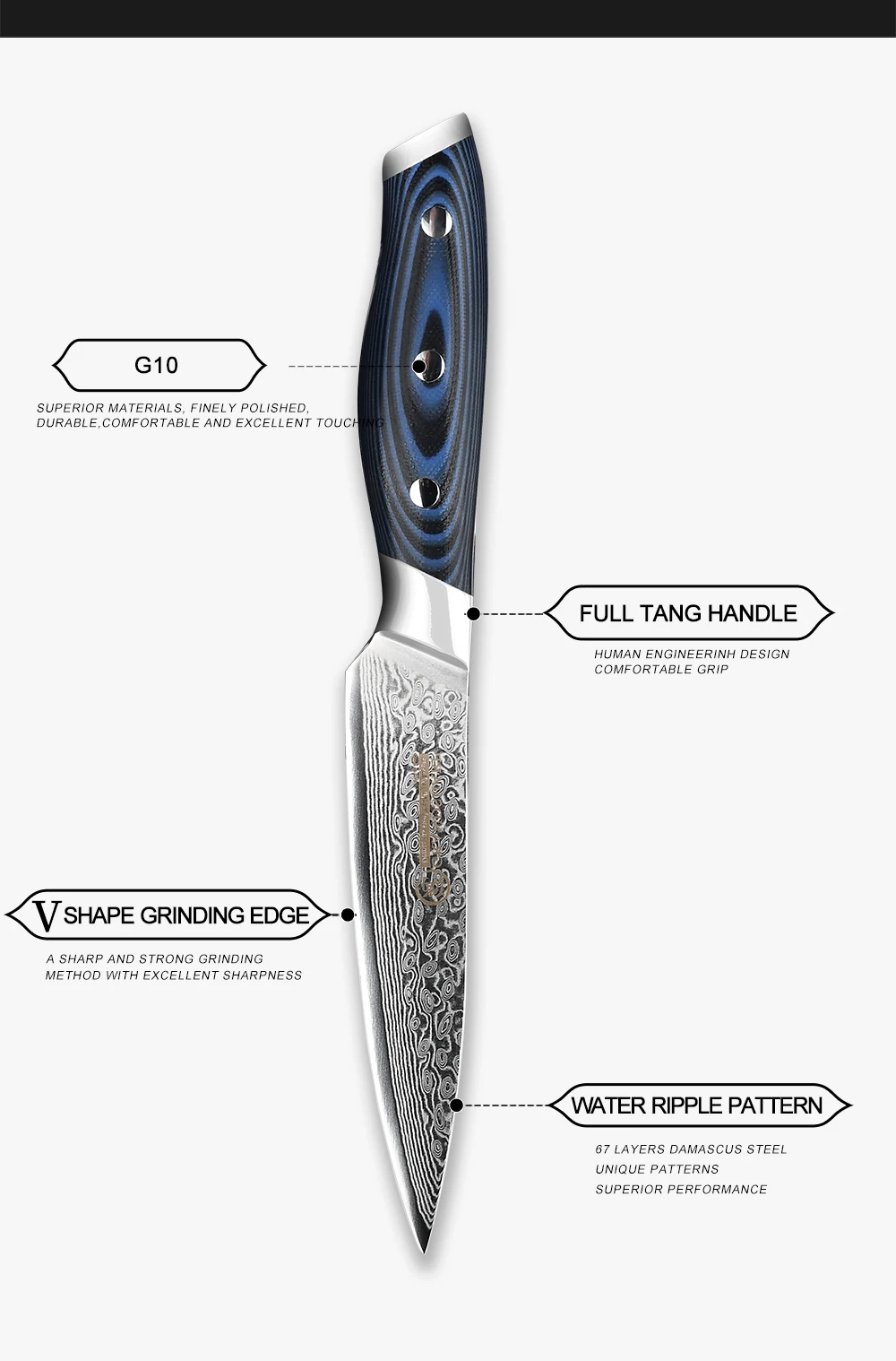 Описание: 67 слоев японской дамасской стали и VG10 core набор ножейМатериал: 67 слоев японской дамасской стали и сердечник vg10.Ручка: отличная G10Ручка, полировка поверхности. Используйте в течение длительного времени для защиты окружающей среды.Твердость: 60 ± 2 HRCХарактеристики: острые и прочные; Очень стойкие к коррозии.Материал и ремесло: многослойная Дамасская сталь, импортированная из Японии VG10 core, обработка оптических линз, процесс ковки.Уровень остроты: уровень силы резания: 6,0-8,0 Н по международным стандартам.