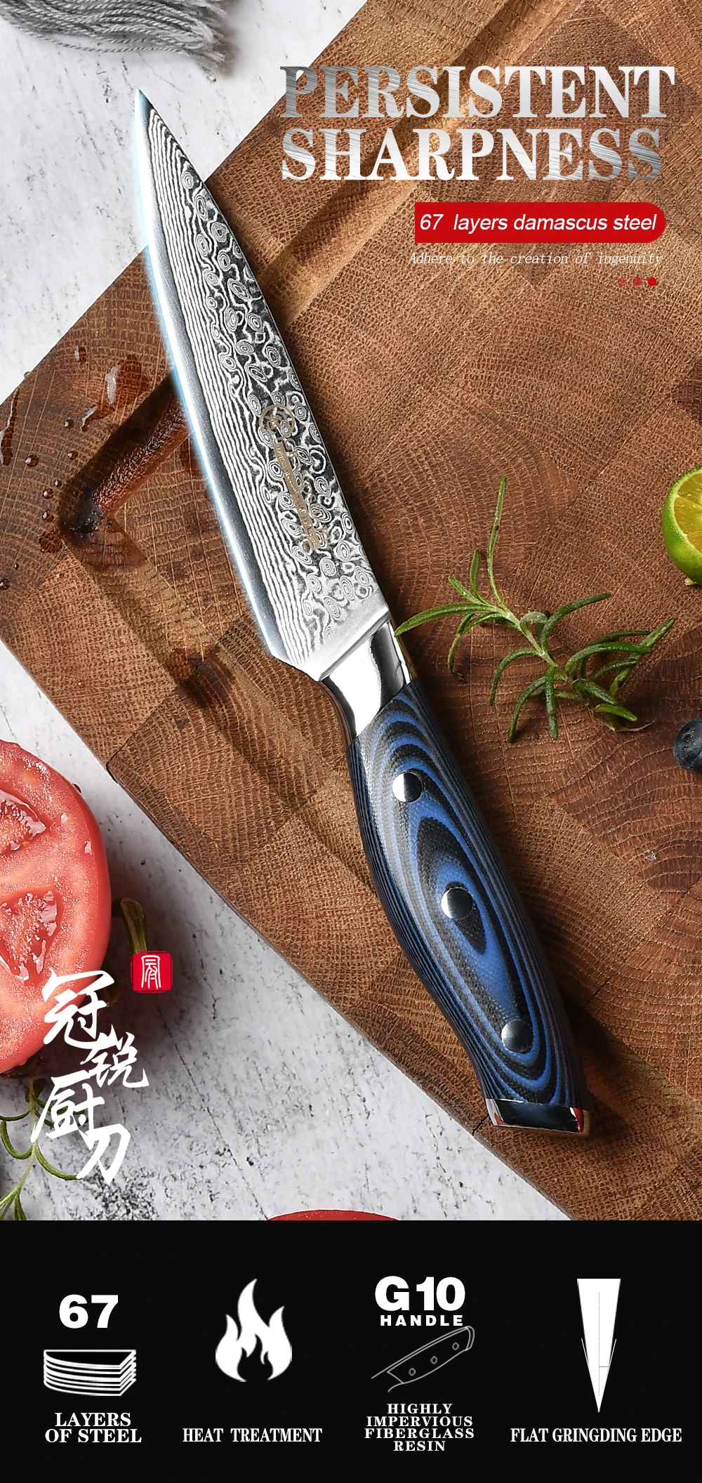 (Изготовлен из 67-слойной дамасской стали, импортированной из Японии.Режущий сердечник из VG-10 стали;