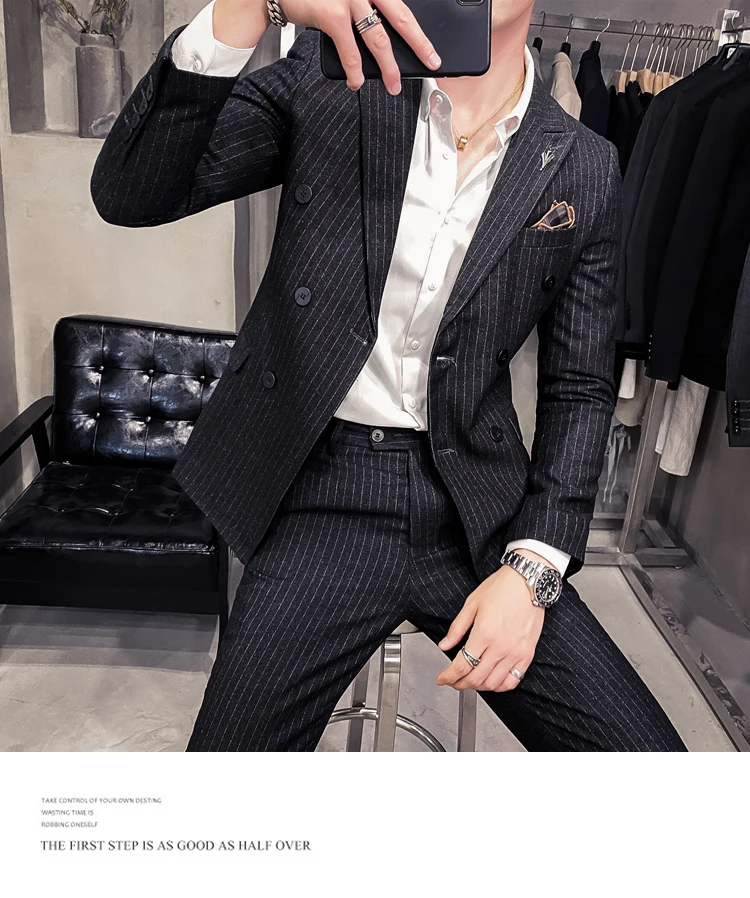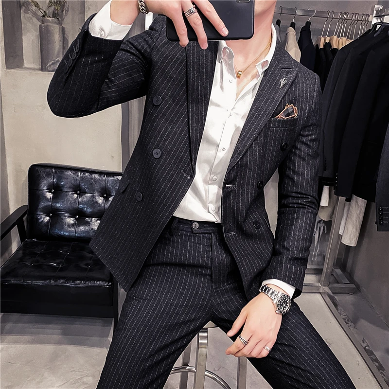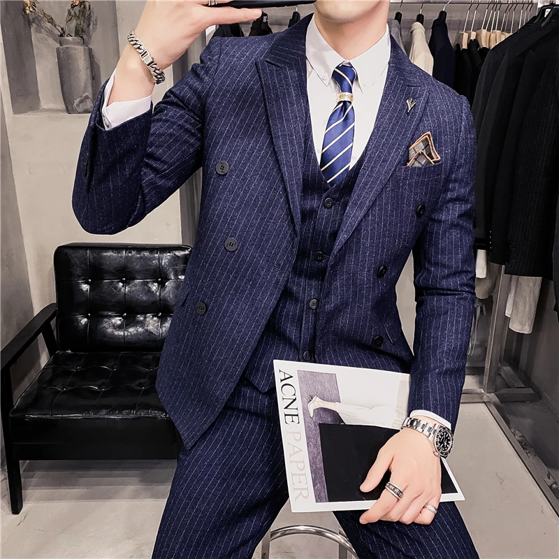 (Пиджак + жилет + брюки), модный мужской двубортный деловой костюм в полоску, повседневный официальный костюм, комплект из 3 предметов для жениха, свадьбы