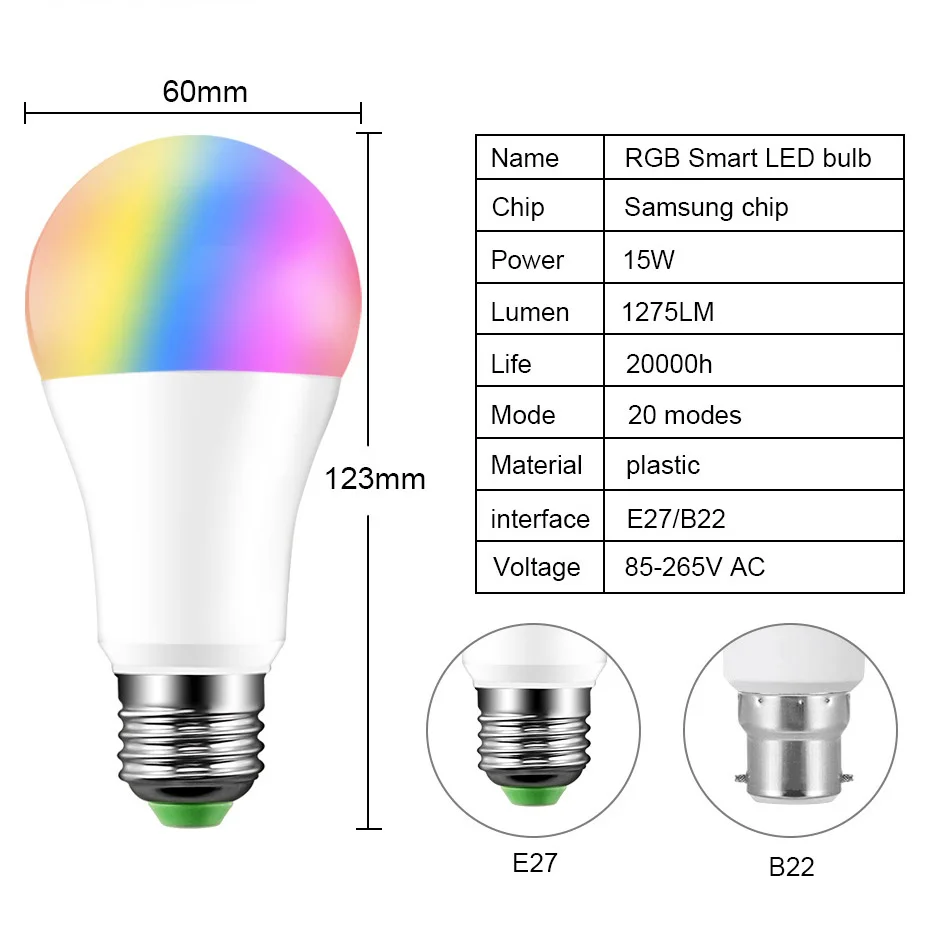 Светодиодная лампа E27, Bluetooth, 15 Вт, 85-265 В переменного тока, RGB, управление музыкой, 20 режимов, подходит для IOS Android, с регулируемой яркостью, для домашсветильник щения