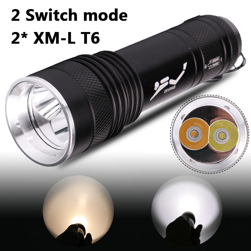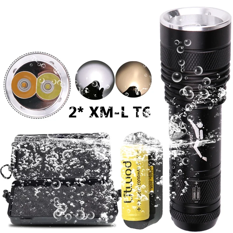 Фонарик для дайвинга с 2 светодиодными лампами, Профессиональный Подводный фонарь из алюминиевого сплава для дайвинга, с аккумулятором 18650, белый и желтый рыболовный фонарь, 80 м