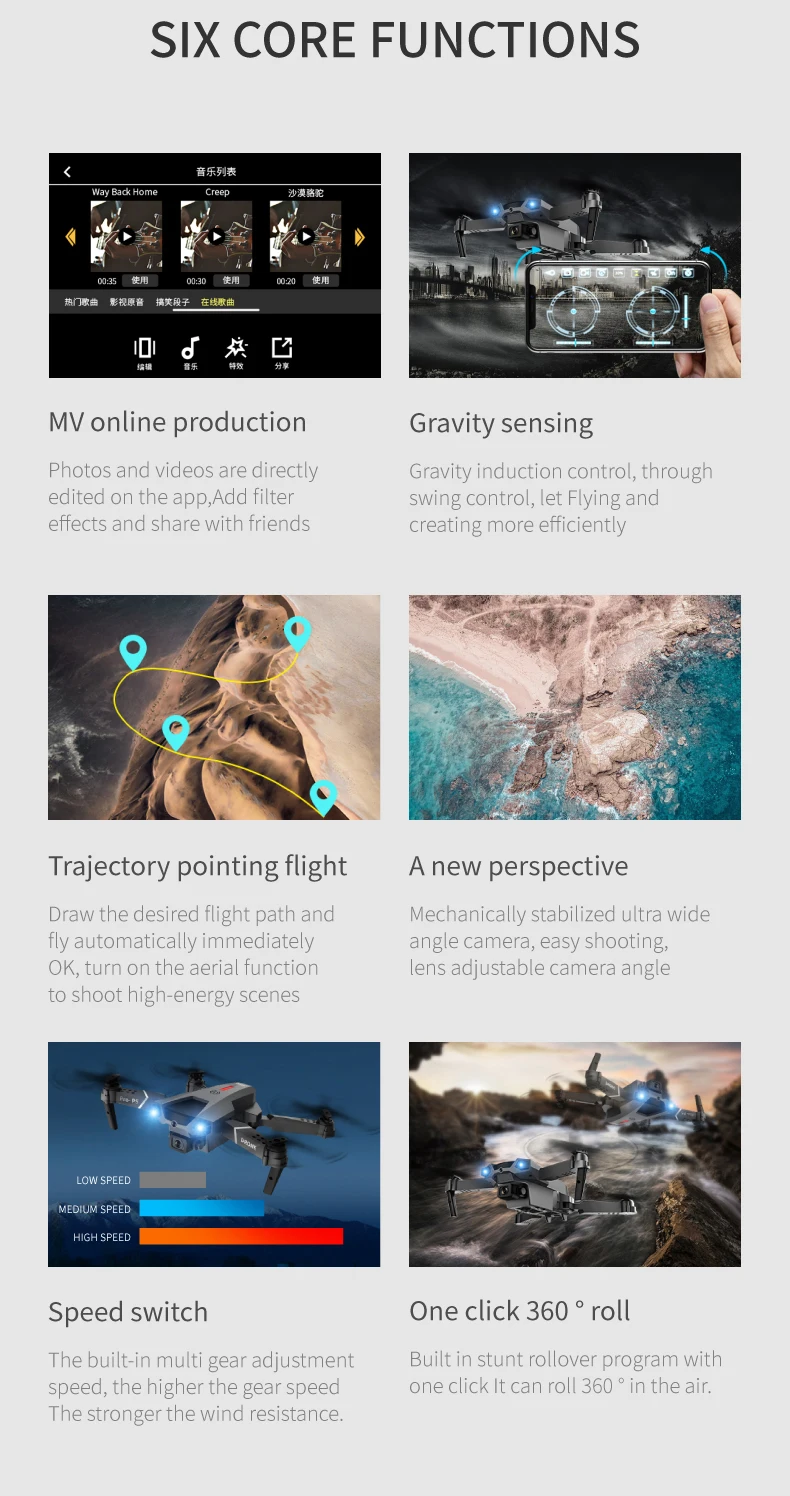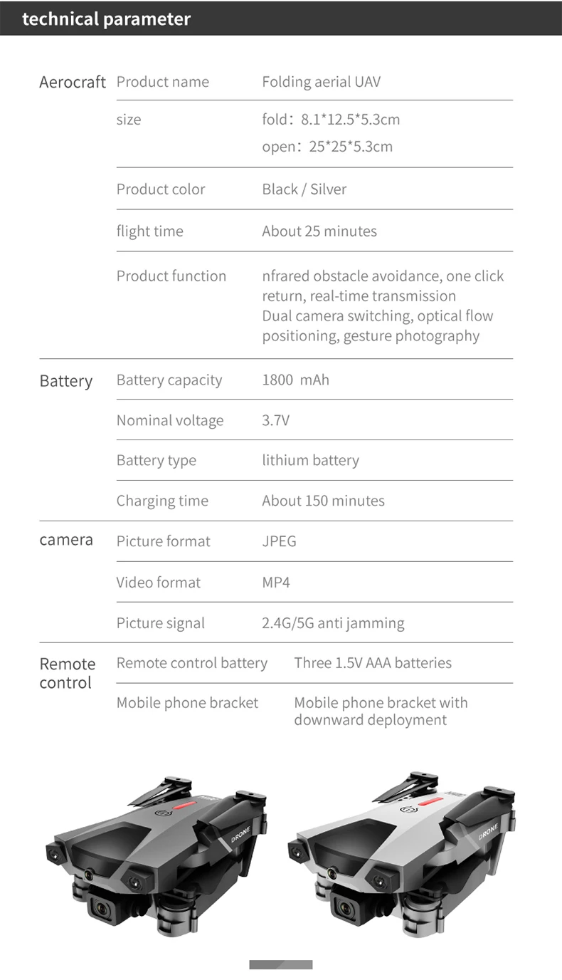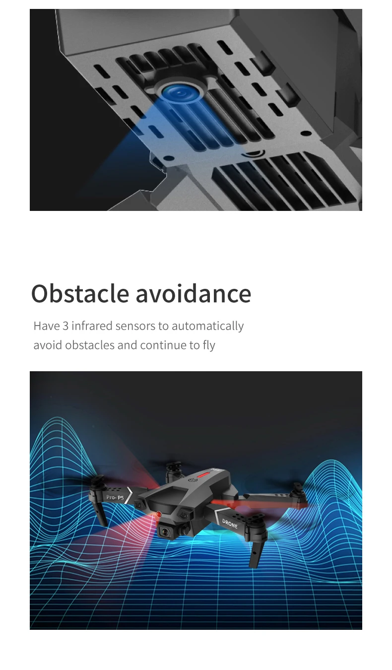 На расстоянии 1 метра от препятствия Дрон будет использовать инфракрасный светильник, который он переносит, чтобы избежать препятствий. Это может предотвратить беспилотник от управления полетом во времени и избежать препятствий во время полета.-Складные руки, компактная конструкция, легко носить с собой.-Подключаемое приложение с функцией Wi-Fi, вы можете делать фотографии/видео через камеру телефона и передавать изображения в режиме реального времени. Вы можете получить наиболее реалистичное изображение, чтобы показать нам. Есть отличные видео эффекты в визуальном-Встроенная функция возврата в дом (RTH) может обеспечить более безопасный полет. Когда батарея Низкая или сигнал слабый, Дрон автоматически и точно вернется домой, не беспокоясь о потере дрона.-Оптическое позиционирование потока. Фиксированная высота делает съемку в помещении более легкой и стабильной.-Режим удержания высоты. Установив внешнее давление воздуха, Квадрокоптер может постоянно парить в воздухе, что облегчает съемку.-Фото жестов/видео. Вы будете записывать свою красоту с помощью жестов, сломать старый способ фотографирования и открыть для себя новые вещи (в пределах 3 м)-Самое длинное время полета составляет 15 минут. Большой емкости 3,7 V 1800mAH аккумуляторная батарея может производить до 15 минут времени полета.-Следуй за мной. Независимо от того, куда вы идете, Дрон автоматически отслеживает и захватывает вас. Оставайтесь на фото в любое время, вы можете легко получить сложные фотографии и предоставить функции полета без рук и селфи.-Режим полёта Waypoint. Откройте приложение для дрона, используйте план полета у вас под рукой, просто нарисуйте маршрут на экране, и вертолет будет автоматически летать в соответствии с указанным путем.-Объемный звук с фиксированной точкой. Выберите точку, и Дрон полетит вокруг этой точки.-Шестиосевой гироскоп, полет более стабильный и простой в управлении.-Фюзеляж quadcopter изготовлен из высокопрочного инженерный пластик, который является светильник в весе и прочный.