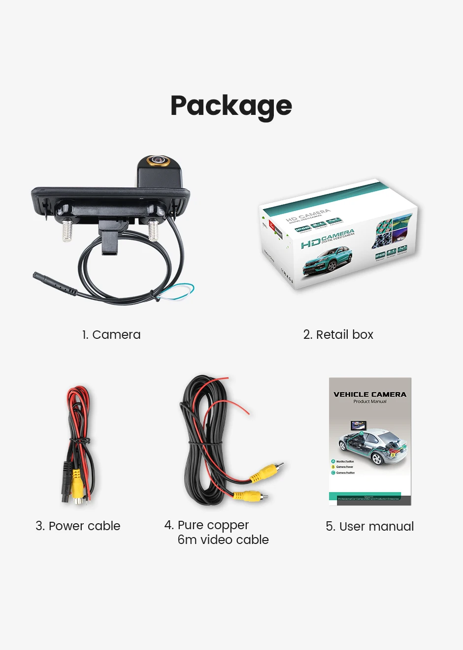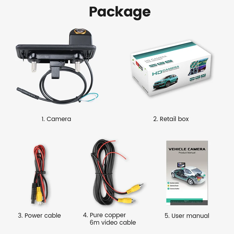 1. Камера заднего вида2. Розничная коробка3. Кабель питания4. Чистый медный 6 м видео кабель5. Руководство пользователя