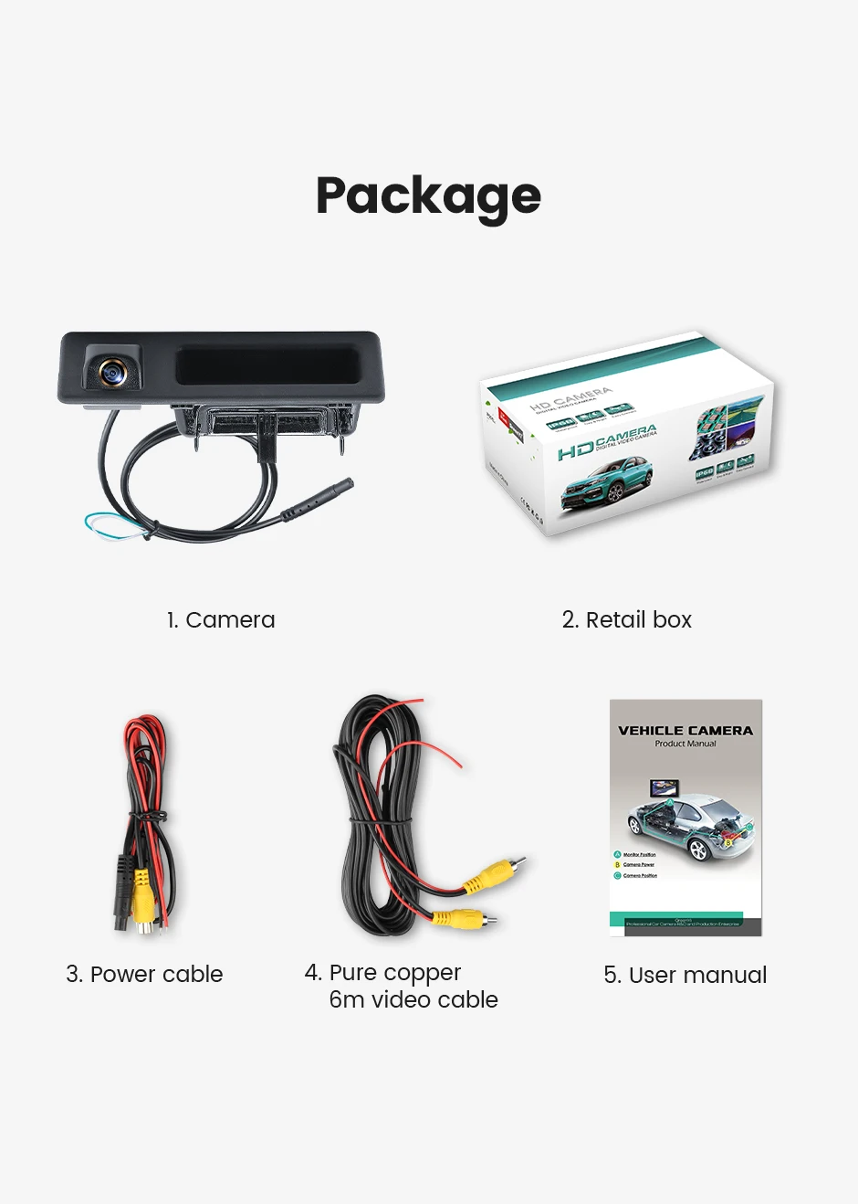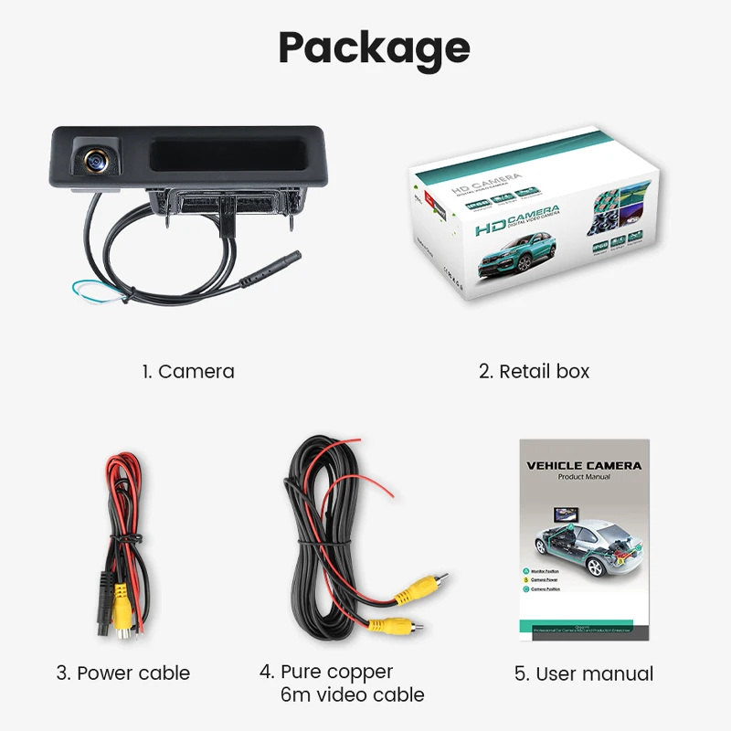 1. Камера заднего вида2. Розничная коробка3. Кабель питания4. Чистый медный 6 м видео кабель5. Руководство пользователя