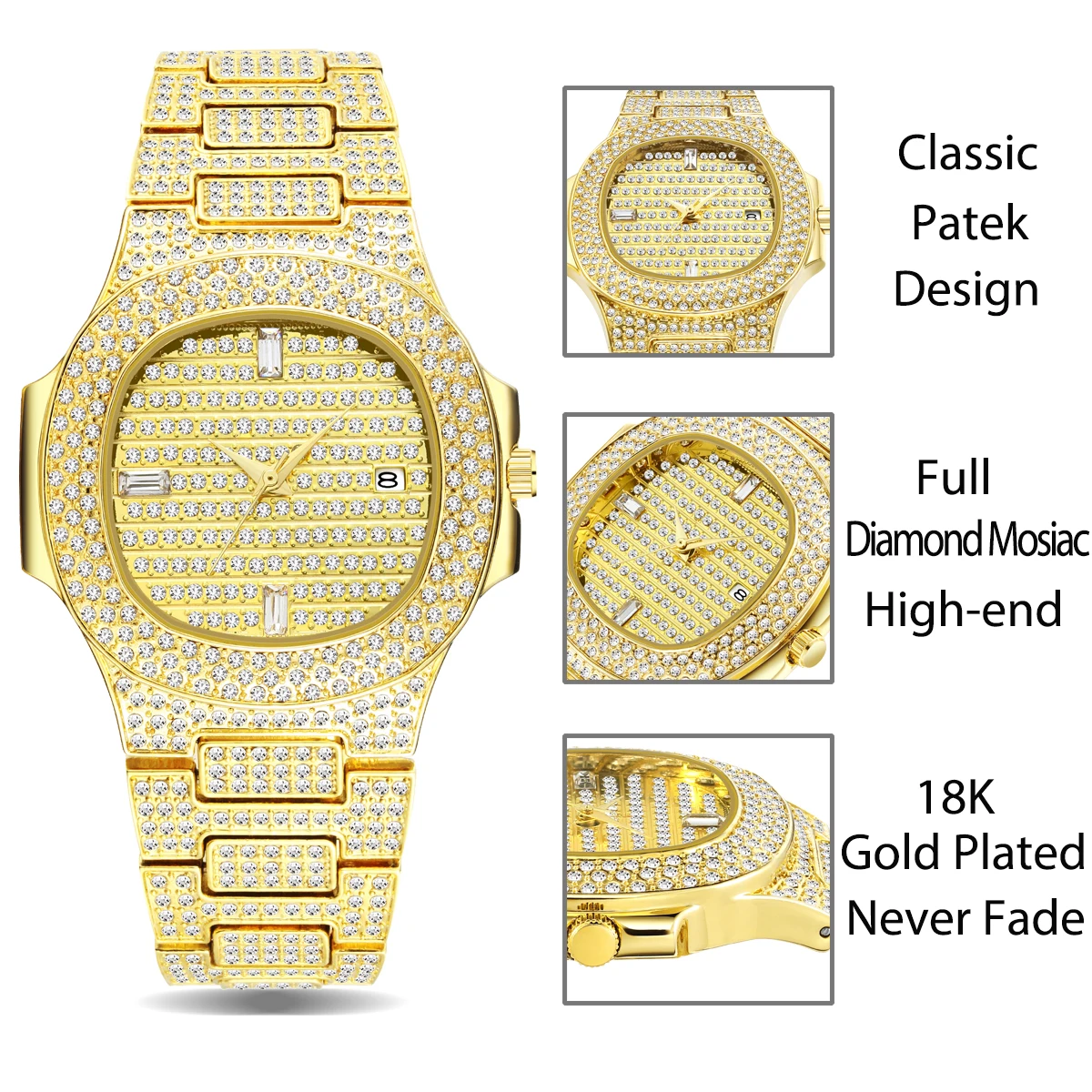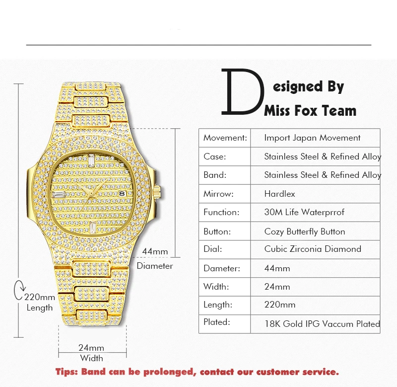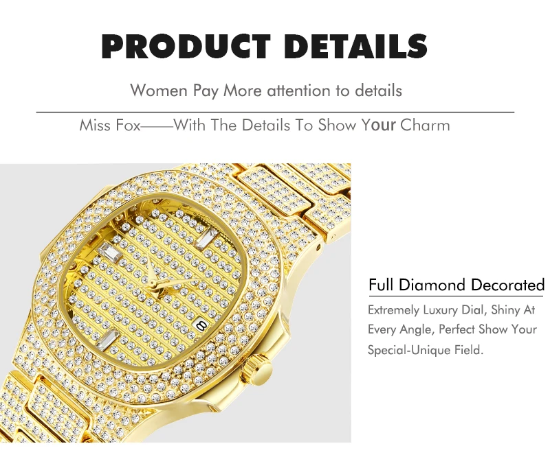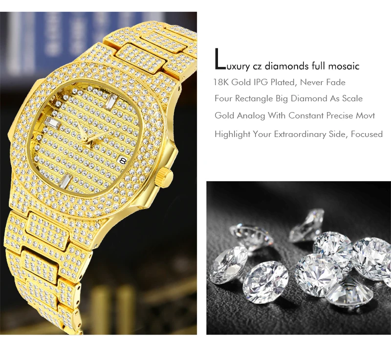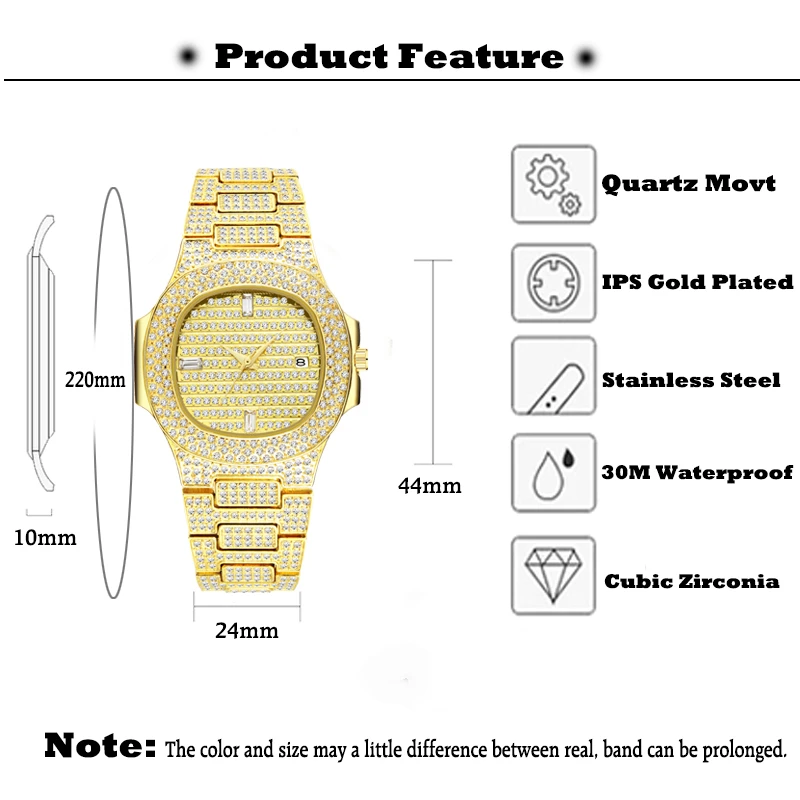 Чехол диаметр: 4,4 см прибл.Чехол Толщина: 1,0 см прибл.Группа Ширина: 2,4 смДлина ремешка: около 22,00 смРегулируемый ремешок: Да, может быть продлен, свяжитесь с нашей Золотой службой поддержки клиентовСтиль: роскошный-Большой алмаз-100% новый и высокое качество.-Точный кварцевый механизм для точного сохранения времени.-30 м Водонепроницаемость (не для душа и плавания), ударопрочность-18K золото нано вакуумное покрытие, золотой цвет не выцветает.-Ватенлайн, рождественский подарок, отжиг, вечерние, день рождения, одежда для свиданий.