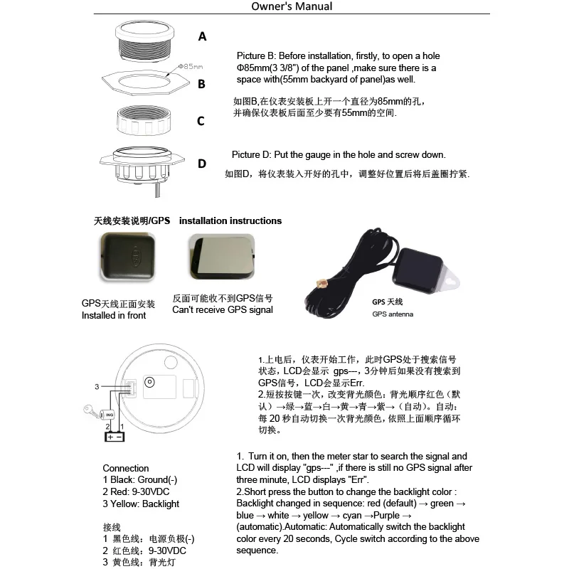 -Циферблат: черный/белый-Материал: Безель из нержавеющей стали 316L + противотуманное стекло-Диаметр установки: Φ85 мм или 3-3/8"-Сигнал: GPS-Рабочее напряжение: 9 ~ 32 В постоянного тока-Рабочий ток: ≤ 100 мА-Рабочая температура: -30 ℃ ~ 75 ℃-Температура хранения: -40 ℃ ~ 85 ℃-Размер: 12x8x12 см/4,72x3,1x4,75 дюйма-Класс водонепроницаемости и пыленепроницаемости IP67-Диапазон индикации: 0-30 км/ч, 0-60 км/ч, 0-120 км/ч, 0-200 км/ч-Подсветка: красный/7 цветов подсветки