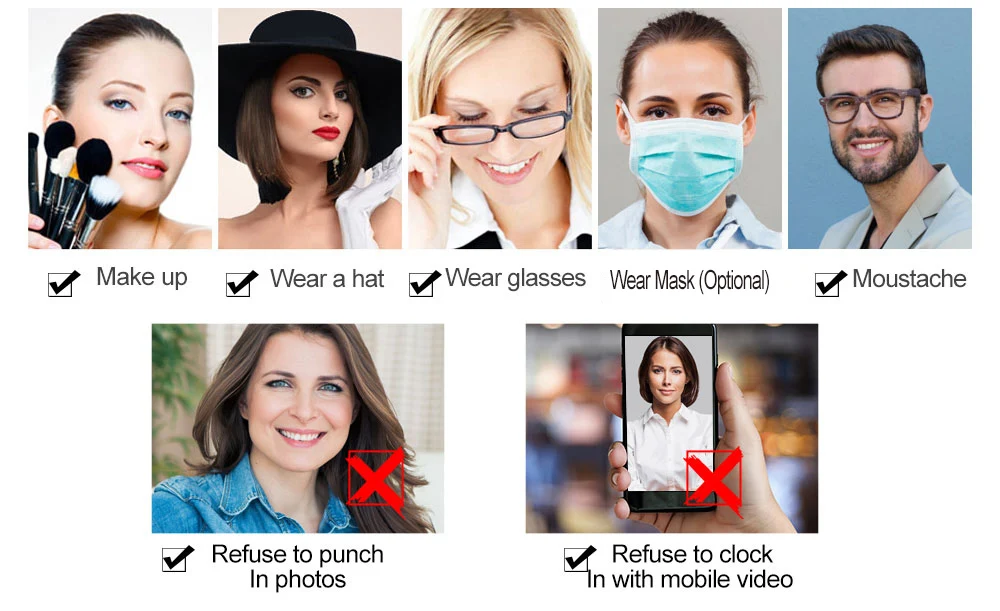 Товар не только предотвращает использование сотрудниками фото или видео посещаемости, но также разумно распознает изменения в вашем внешнем виде. Даже если у вас есть макияж, шляпы и очки, вы можете быстро идентифицировать их без очереди.