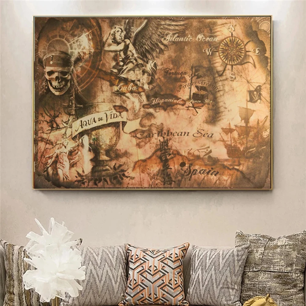 Плакат-карта с изображением пиратов Карибского моря, Картина на холсте, декор для гостиной, спальни, картины без рамки