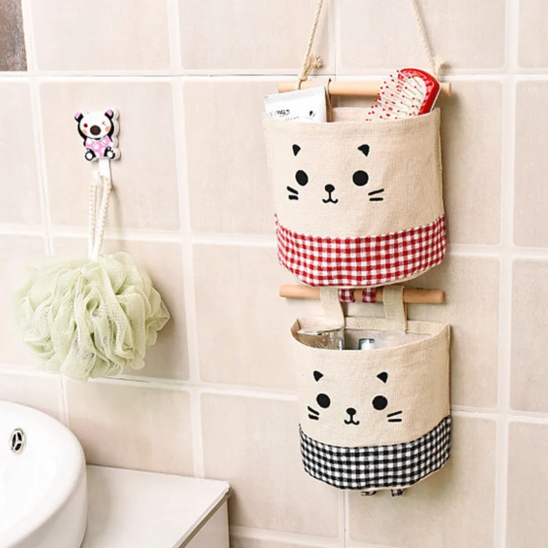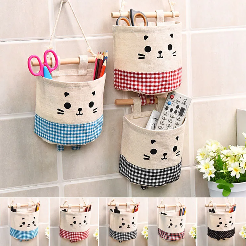 Настенные сумки для хранения, органайзер с мультяшным котом, карманный шкаф, подвесная сумка, контейнер для косметики, хлопковая льняная дверь, настенный шкаф