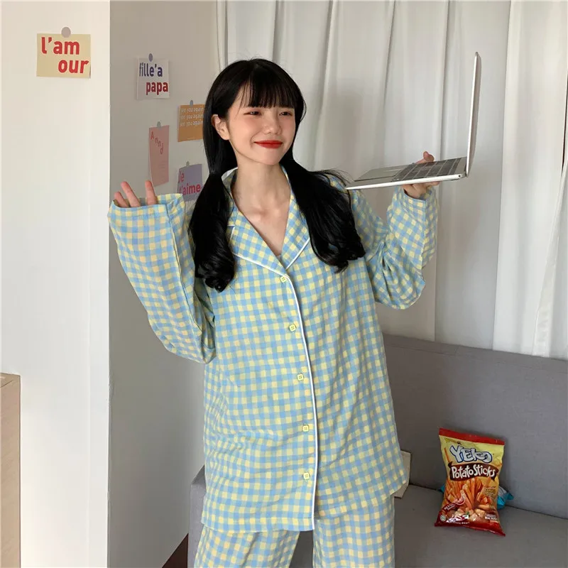 Осенние пижамные комплекты Ulzzang в клетку и в стиле преппи с длин...