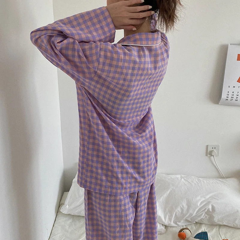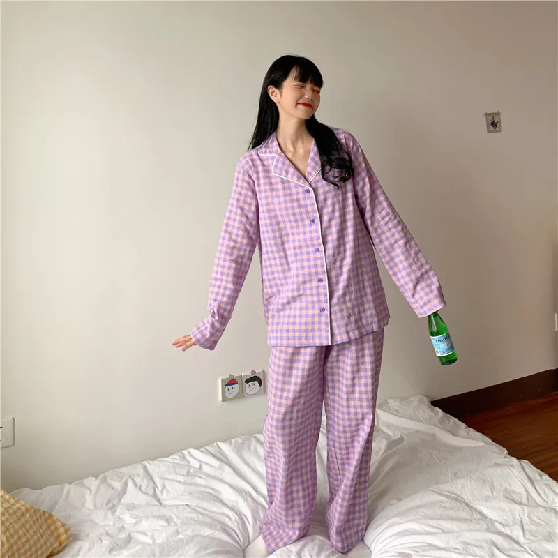 Модный Фиолетовый пижамный комплект в клетку с принтом, Женская милая пижама в Корейском стиле, домашняя одежда для студентов, зимний костюм из двух предметов с длинным рукавом