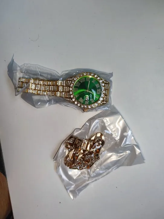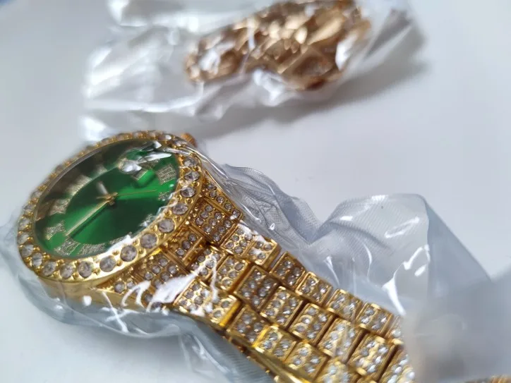 Часы и браслет мужские из нержавеющей стали, украшенные камнями, с календарем, в стиле хип-хоп, цвет золото, 2 шт.