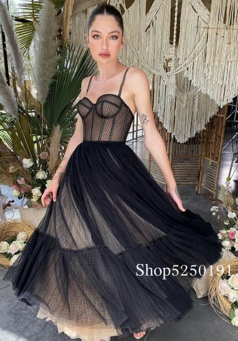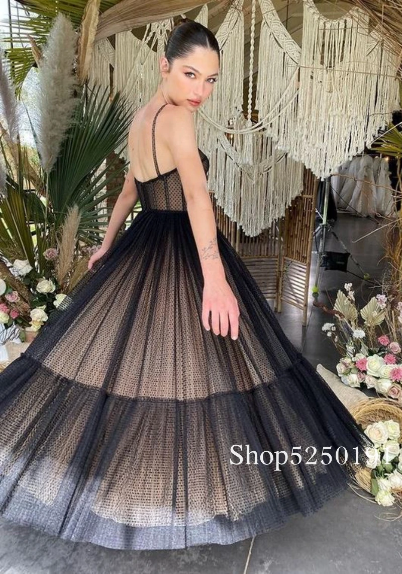Новое поступление, черные строгие вечерние платья в горошек, трапециевидного силуэта, на бретелях-спагетти, до щиколотки, 2021