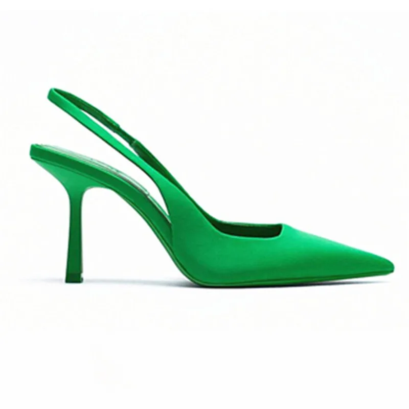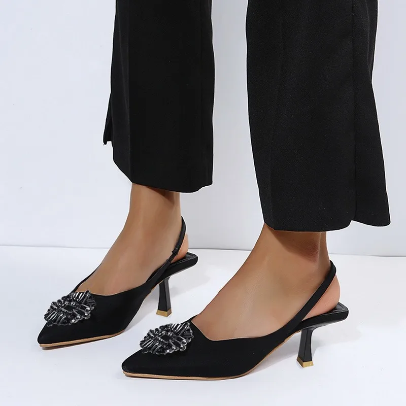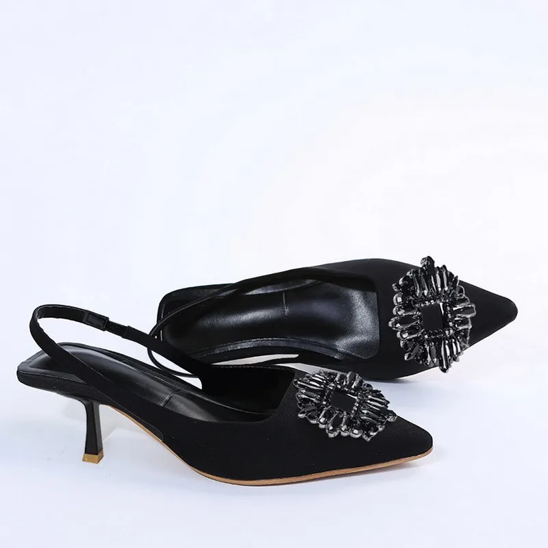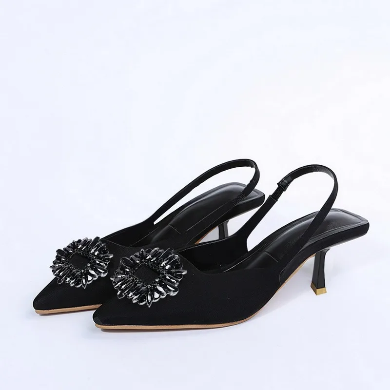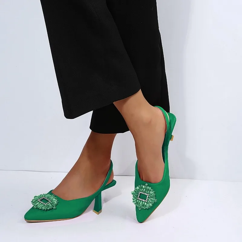 Женские туфли с острым носком, светло-желтые туфли со стразами и закрытым носком, босоножки на низком каблуке с ремешками сзади для женщин, Новое поступление 2021