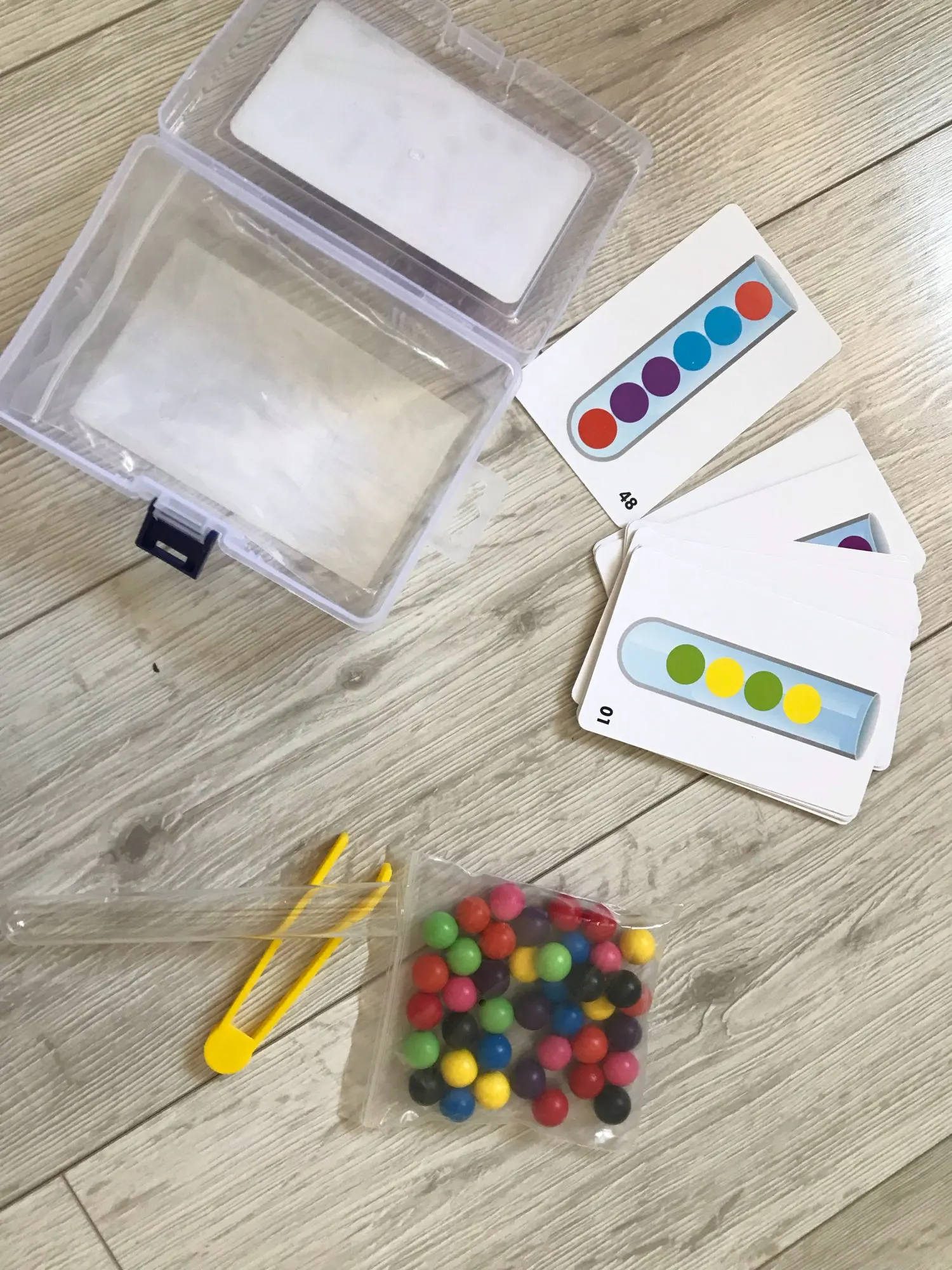 Я до последнего не верила, что выиграла, пока не получила эту красоту. МЕГА большое спасибо продавцу за конкурс! Отправили сразу после оплаты, и очень порадовала доставка - ну очень быстрая на отделение НП. Игра в коробочке, что позволяет хранить ее долго. Шарики деревянные, разноцветные, каждый цвет по 5 штук. В наборе: шарики, пинцет (удобный) и карточки. Карточки плотного глянцевого картона, двухсторонние. Всего 48 вариантов. Ребёнок в восторге. Спасибо. Мы рекомендуем данный товар!