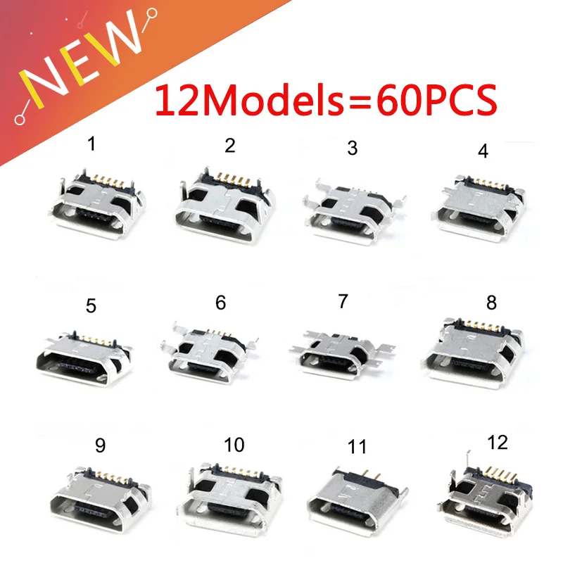 60 шт. = 12 моделей микро-usb разъем 5Pin USB гнездо для MP3/4/5 и других мобильных устройств