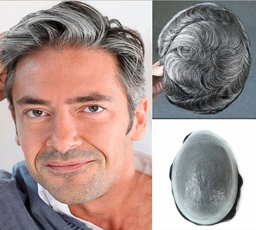Парик BYMC из искусственной кожи для мужчин, 100% серая прядь из человеческих волос, парик для мужчин, индийские волосы без повреждений, мужской парик на замену, мягкий естественный вид