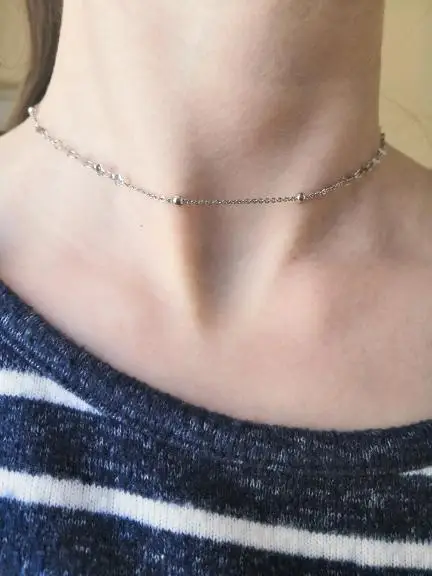 Это круто. Приятно ложится на шею, длина мне подходит, не слишком сильно затягивает шею, но не влияет на нее. Я надеюсь, что линия не растягивается и не станет желтой. Если я добавлю наконечник. Галька идеального размера