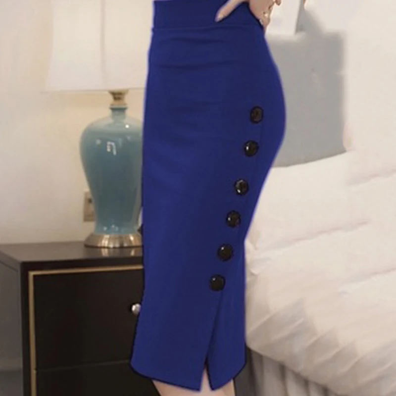 Элегантные женские винтажные офисные юбки OL с высокой талией, с пуговицами, с разрезом, юбки-карандаш для женщин, большие размеры, S-5XL, тянущиеся Юбки миди