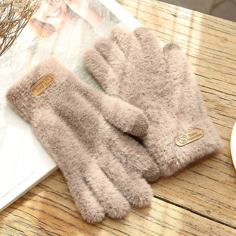 Женские вязаные перчатки, зимние теплые плотные перчатки для сенсорного экрана, однотонные меховые варежки для смартфона, кашемировые шерстяные женские перчатки для вождения