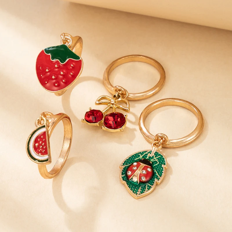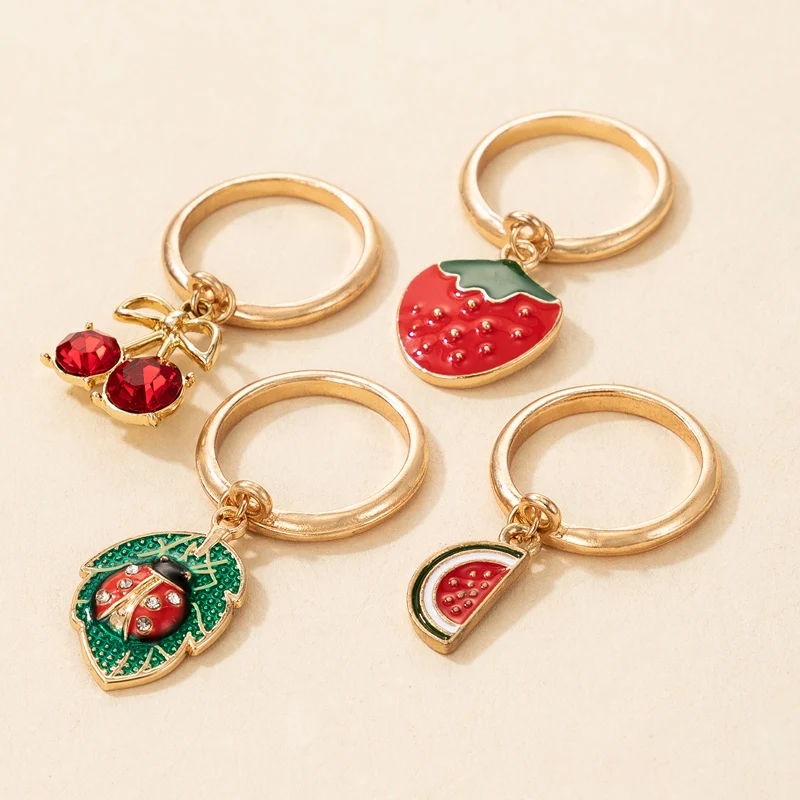 Docona 4 шт.компл. прекрасные кольца в виде фруктов вишни арбуза на костяшках для женщин Роскошные Кристальные красочные божьи коровки набор колец ювелирные изделия