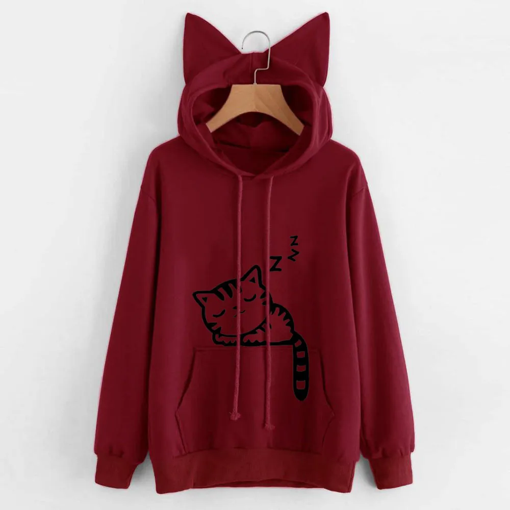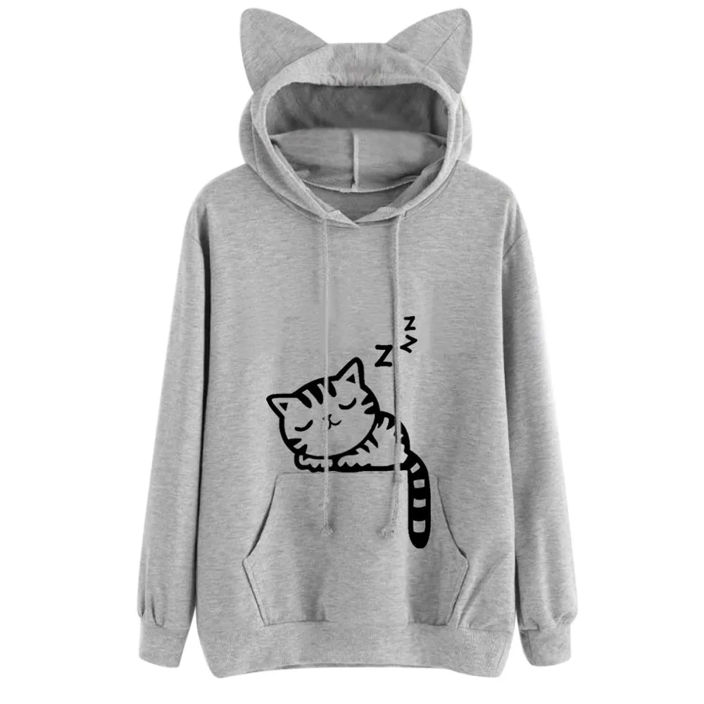 Женские толстовки большого размера с длинным рукавом и принтом кота, пуловеры, осенне-зимние толстовки с капюшоном и кошачьими ушками, топы, Женская толстовка