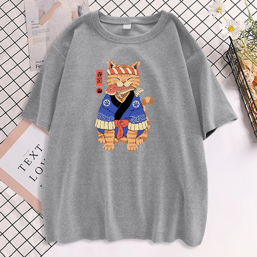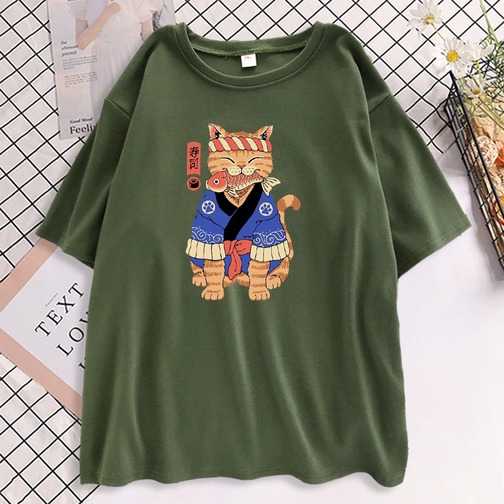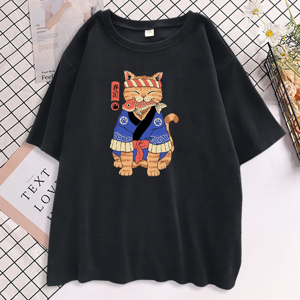 Футболка женская в японском стиле Ukiyo E, с оранжевым котом, Модные свободные футболки в стиле Харадзюку, мягкая Летняя женская футболка с круглым вырезом, 2021
