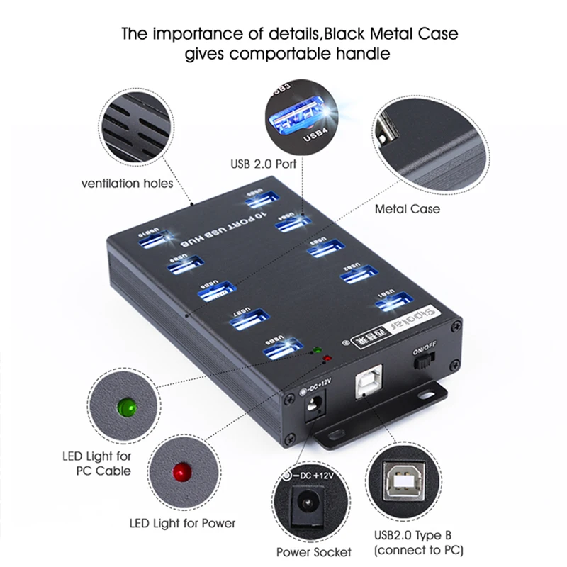 1.A-300 портов промышленного класса 10 2.0 usb-хаб, поддержка подключения устройств 10 шт. одновременно, подключение мобильного жесткого диска, мобильный телефон flash, расширение порта USB. Синхронизация данных скорость передачи данных до 480 Мбит/с.