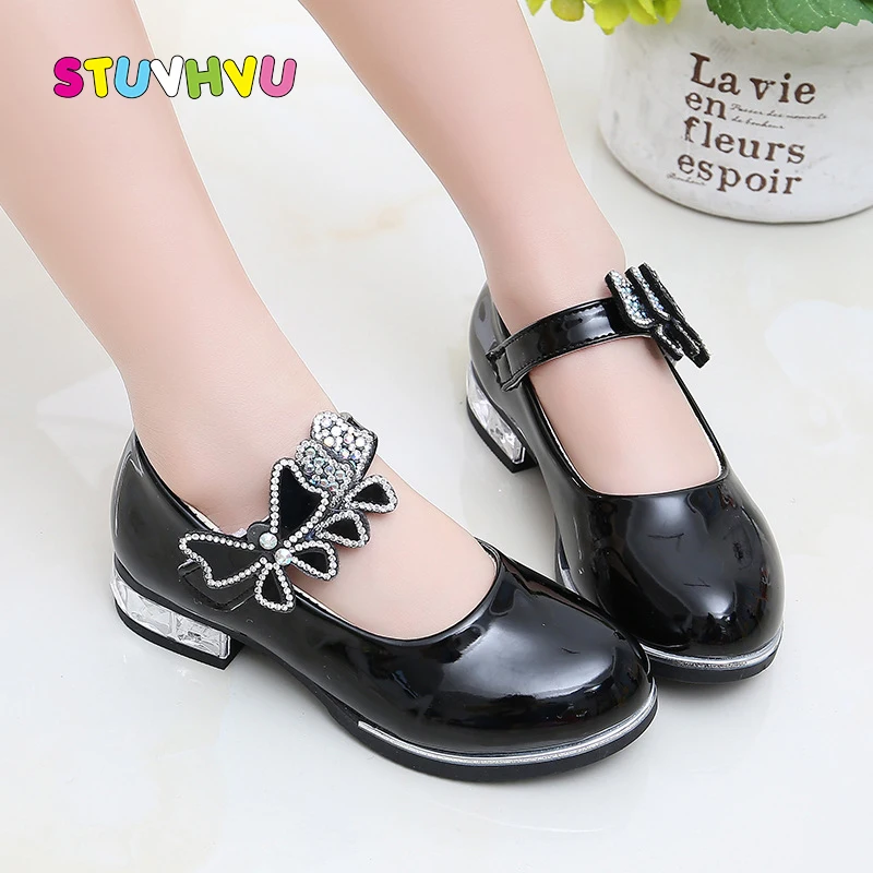 Детская обувь для девочек, черная, кожаная, с бантом, весна-осень, с мягкой подошвой, белого и розового цветов