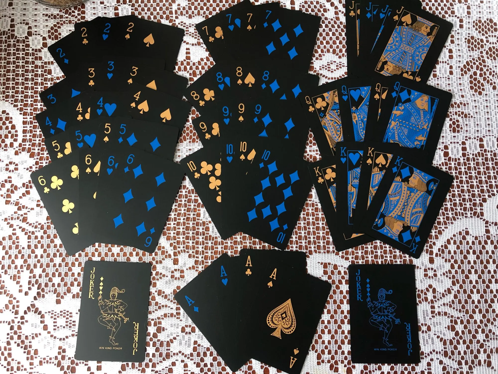 они просто прекрасны, до России (Норильск) прибыли за месяц приятны на ощупь, не рвутся, не мнутся, не мокнут, воздух между ними просто скользит, тяжёлые что помогает тасовки карт, пришли не того цвета но это не важно, главный минус в том что коробка картонная но она тоже приятна на ощупь и прочная