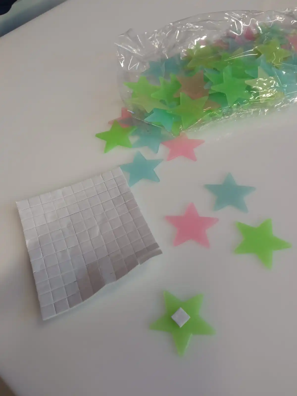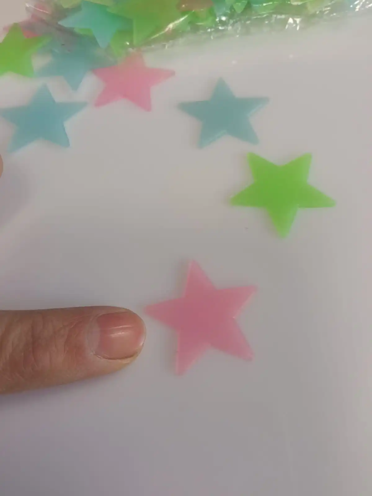 El material es bueno, el tamaño como sale en la descripcion, lo unico que me aburrey se tienen que tomar encuenta es que se tiene colocar unos cuadraditos pequeños para que se pegarlos, no son como pegatinas. En la oscuridad alumbran, no muchisimo como otras que he visto pero se ven bien.