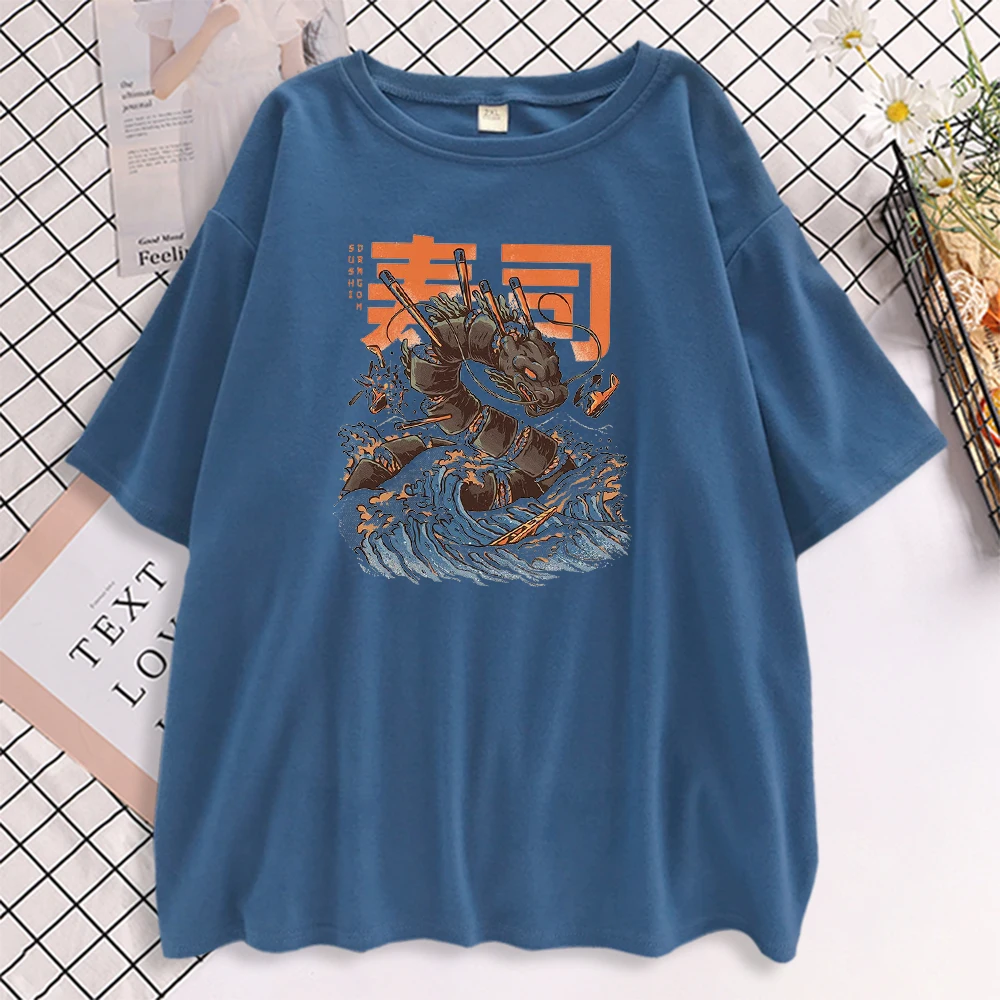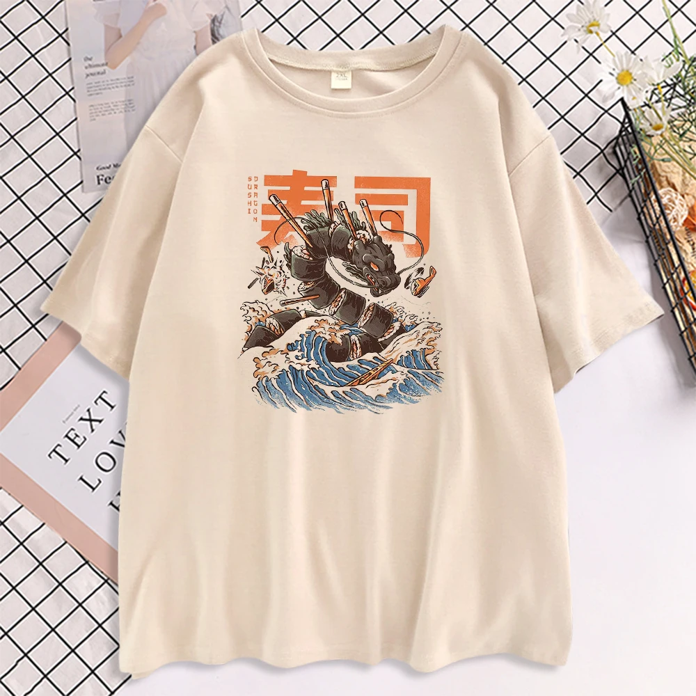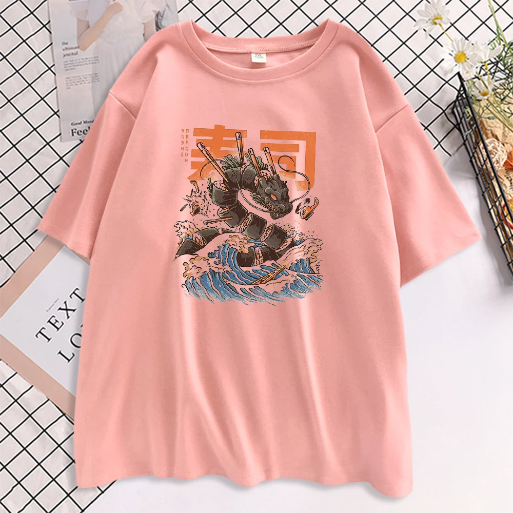 Футболка женская в японском стиле укиё-э с суши-драконом, повседневная Милая рубашка в стиле Харадзюку, уличная одежда розового цвета, лето 2021